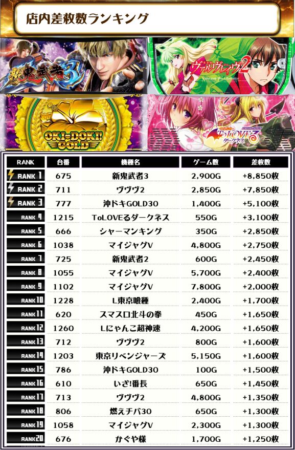 続いては【店内全台の差枚ランキング】をご覧ください!