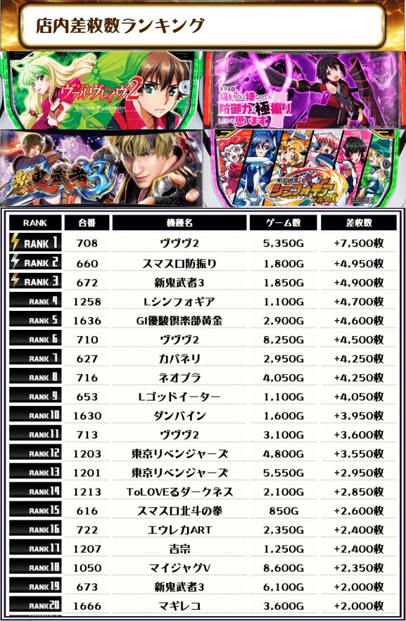 続いては【店内全台の差枚ランキング】をご覧ください!
