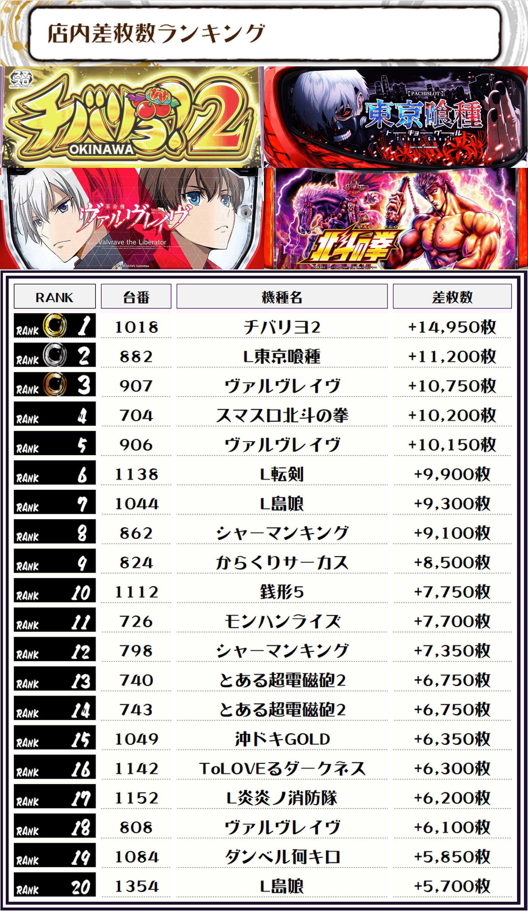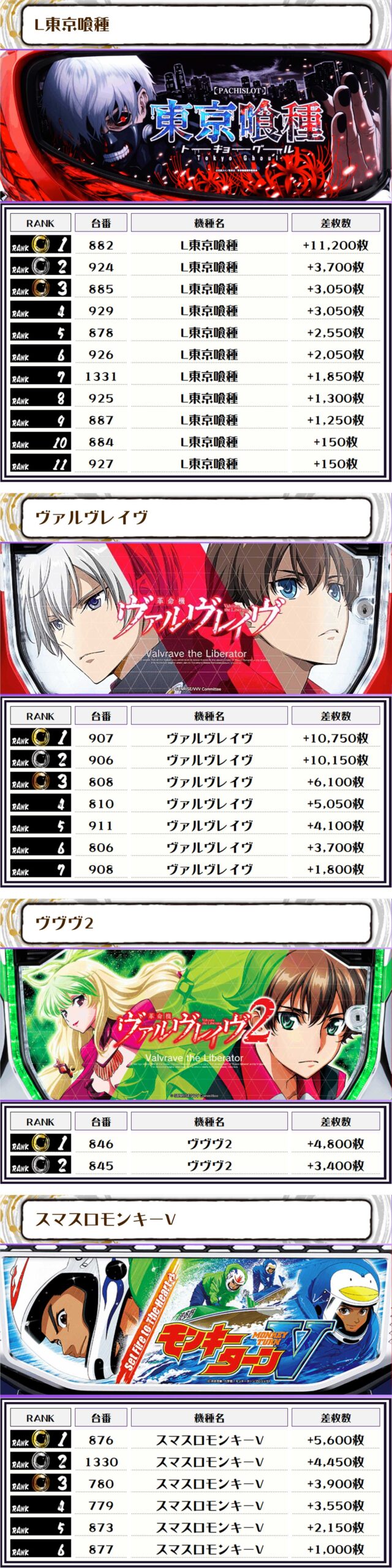 2位には【L東京喰種・882番台】の+11,200枚、そして3位には【ヴァルヴレイヴ・907番台】の+10,750枚がランクインっ🏆🏆🏆🏆