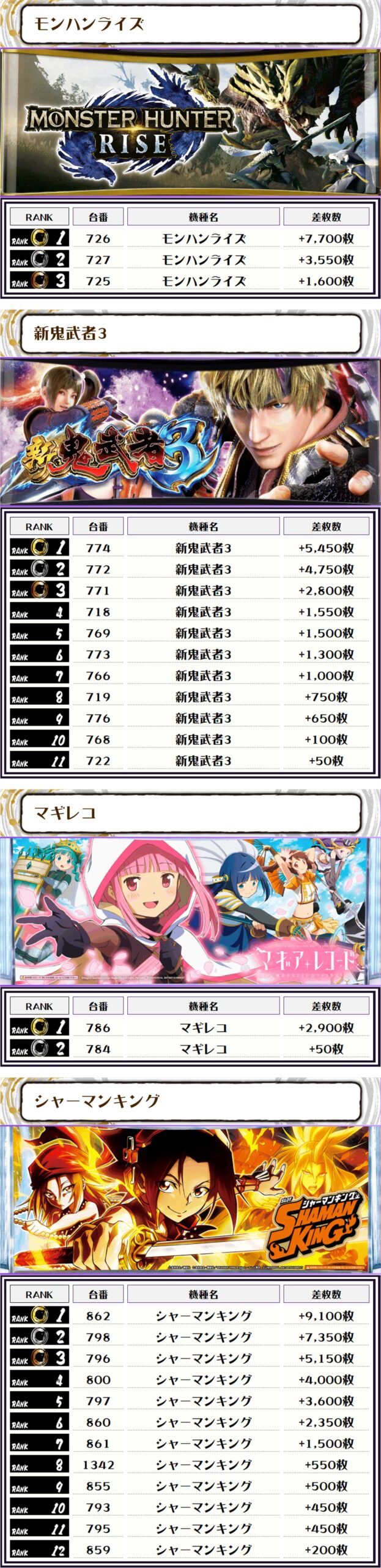 シャーマンキング・モンハンライズは稼働だけでなく、シマ単位での勝率もバツグンでした🎉🎉🎉