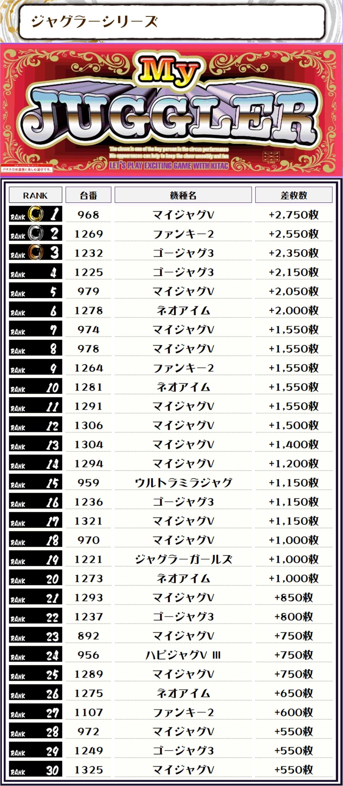 また、この日の店内差枚数ランキングがこちら❗️