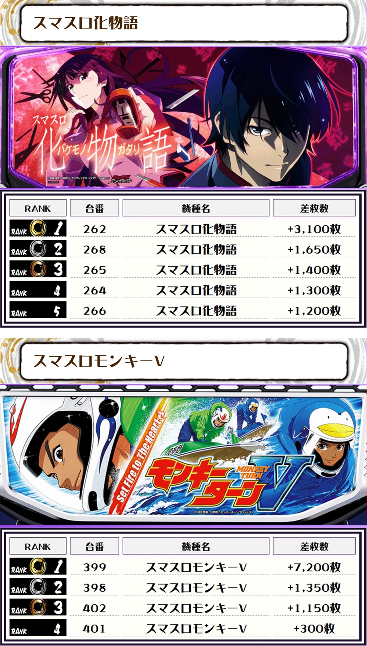 続く2位には【Lゴッドイーター・283番台】の+7,350枚、そして3位には【スマスロモンキーV・399番台】の+7,200枚がランクインですっ🏆🏆🏆🏆