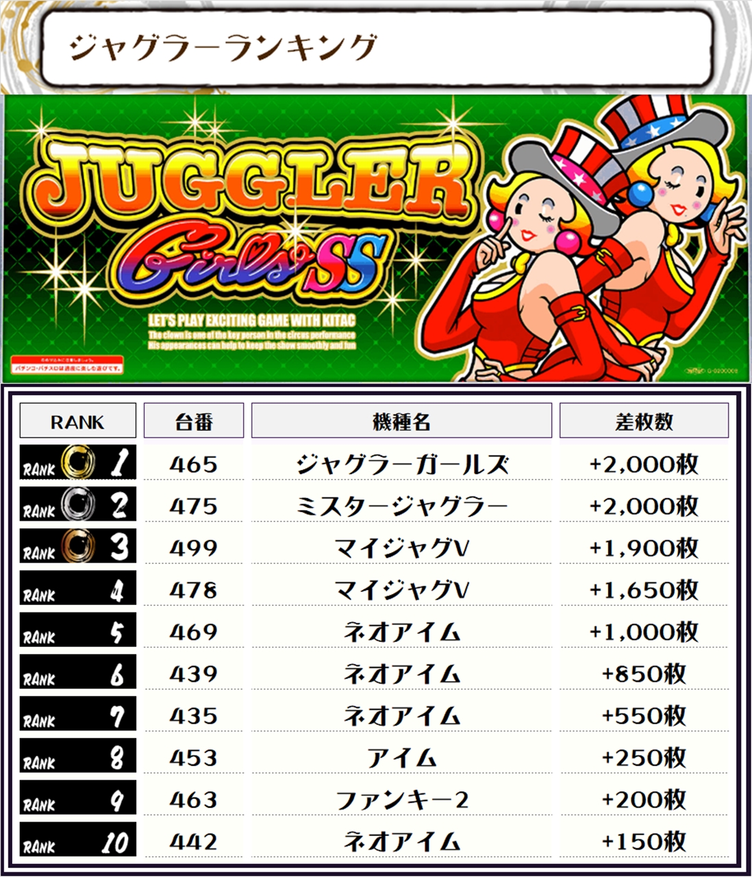 それでは早速【機種別差枚ランキング】をチェックしていきましょう🙆♀️