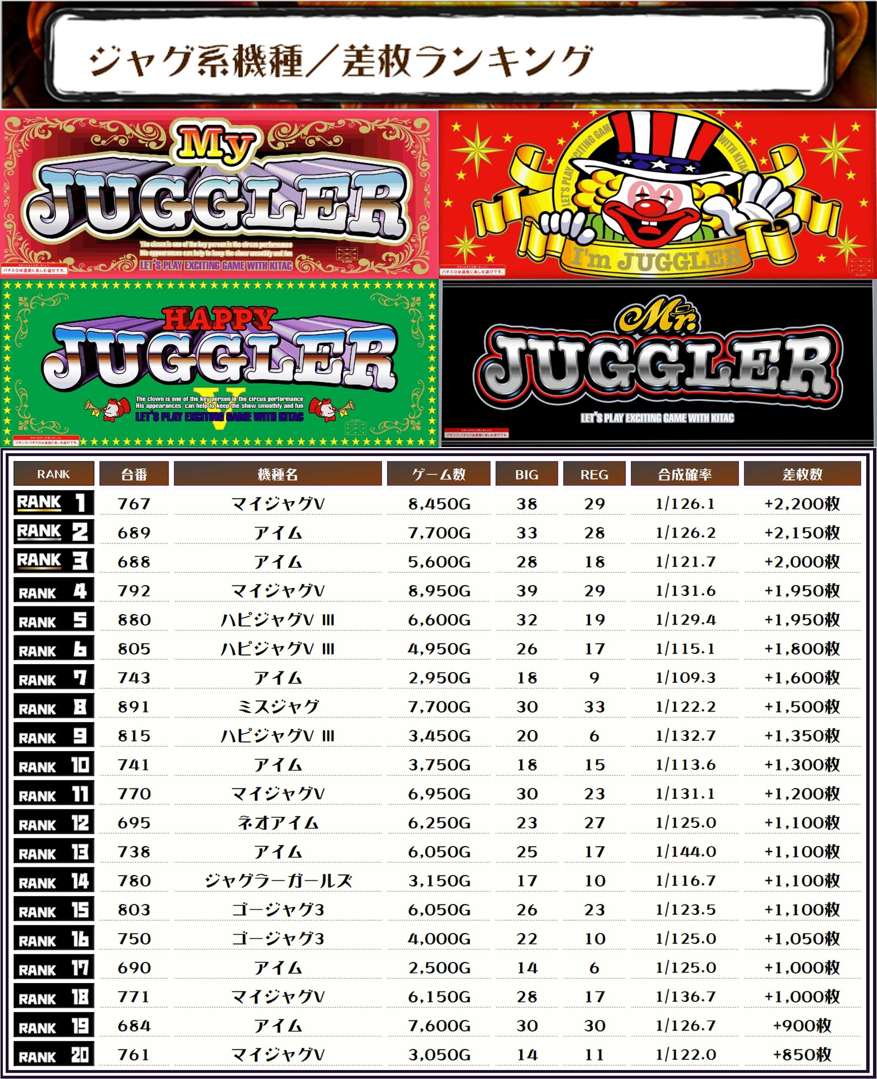 今回もマイジャグⅤ・アイム・ハピジャグV Ⅲを中心としたランキングとなりましたが、ミスジャグといった少数設置台にも優秀台らしき挙動を確認できて大満足です😊👍