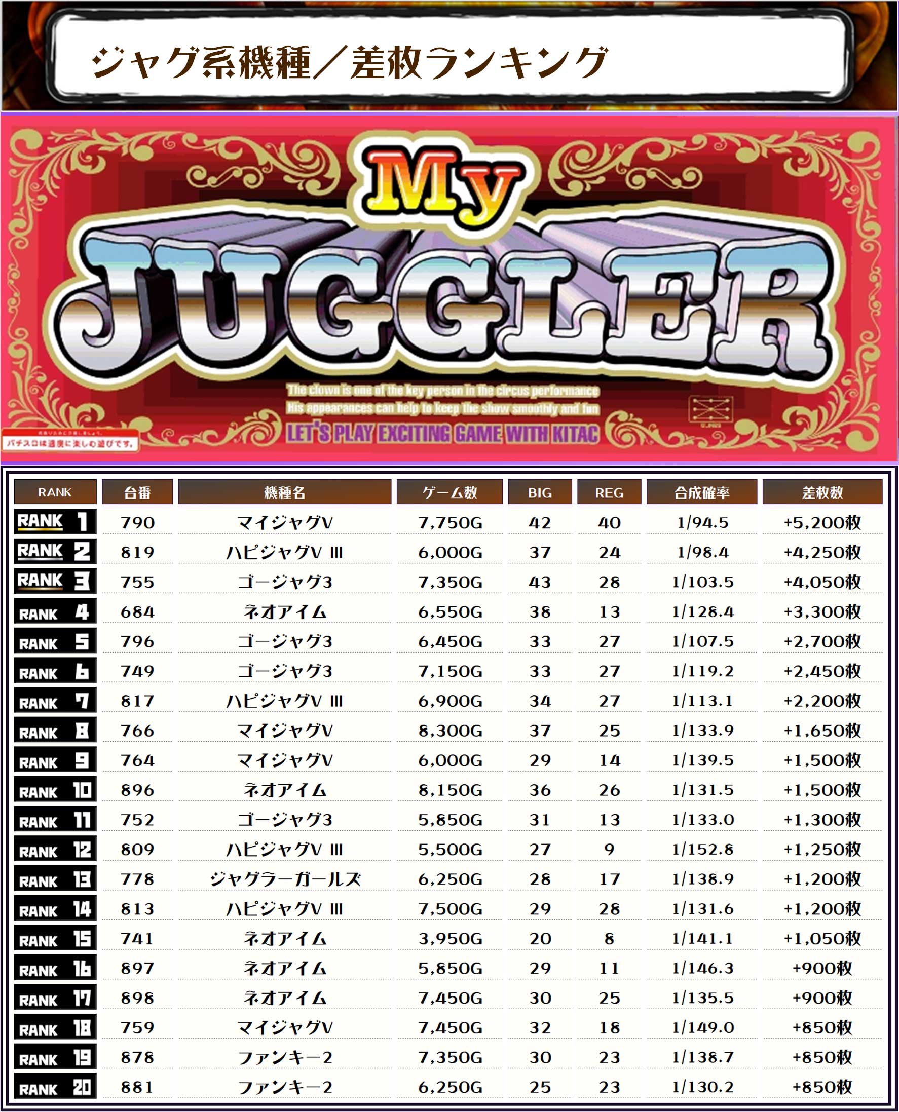 2位には【ハピジャグV Ⅲ・819番台】の+4,250枚、そして3位には【ゴージャグ3・755番台】の+4,050枚がランクインっ😲