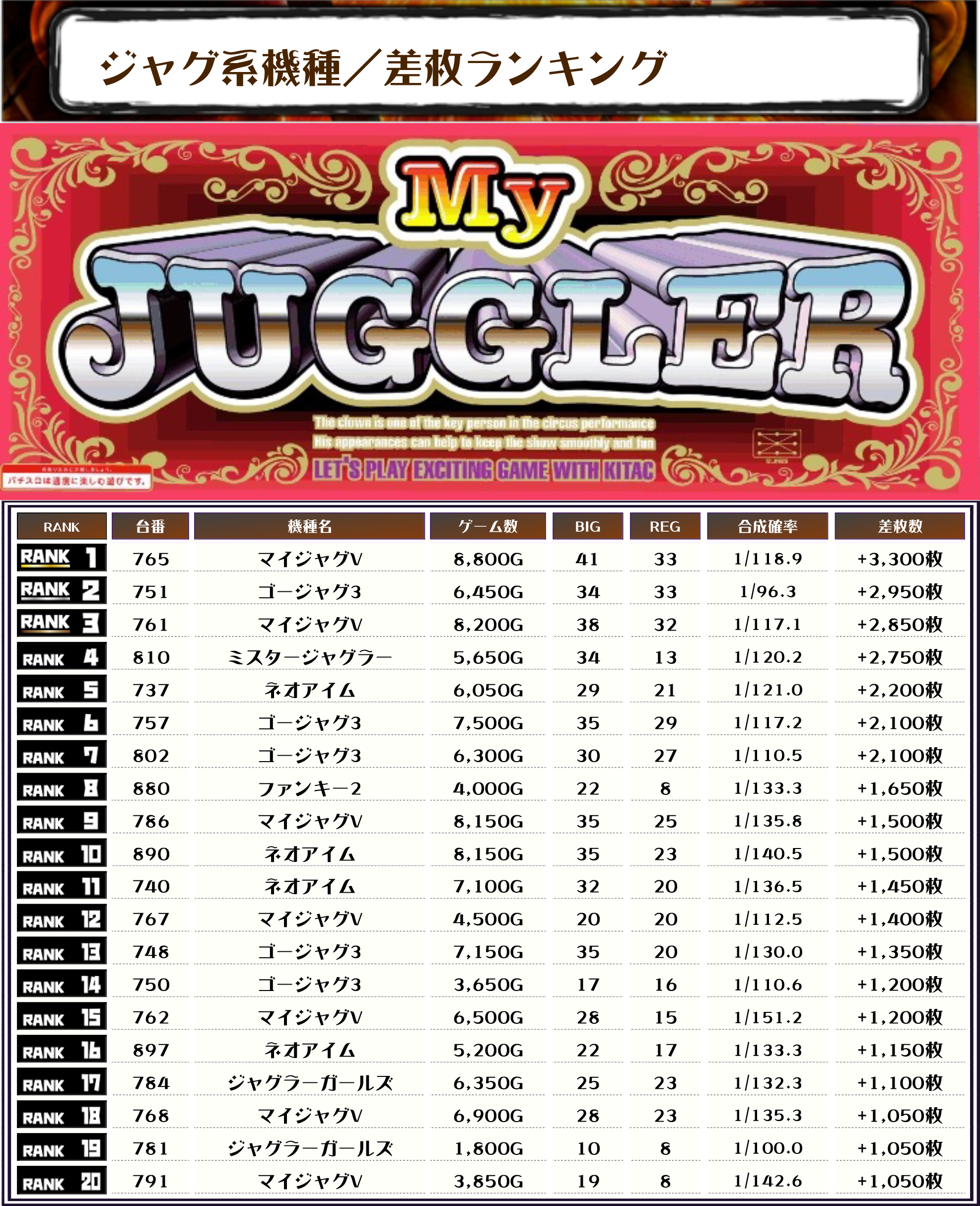 全体のTOP差枚は【マイジャグV・765番台】で+3,300枚👍