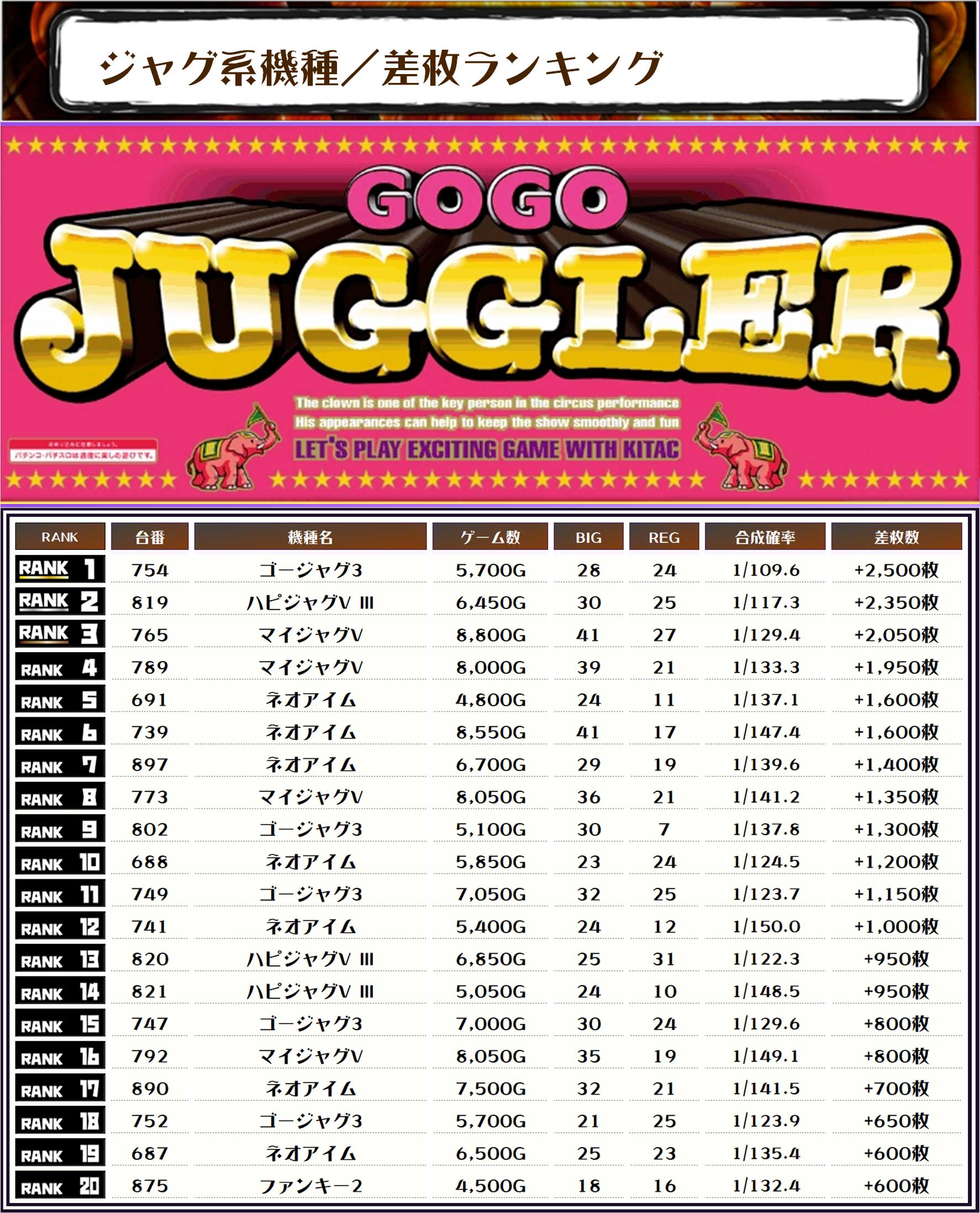 全体のTOP差枚は【ゴージャグ3・754番台】で+2,500枚👍