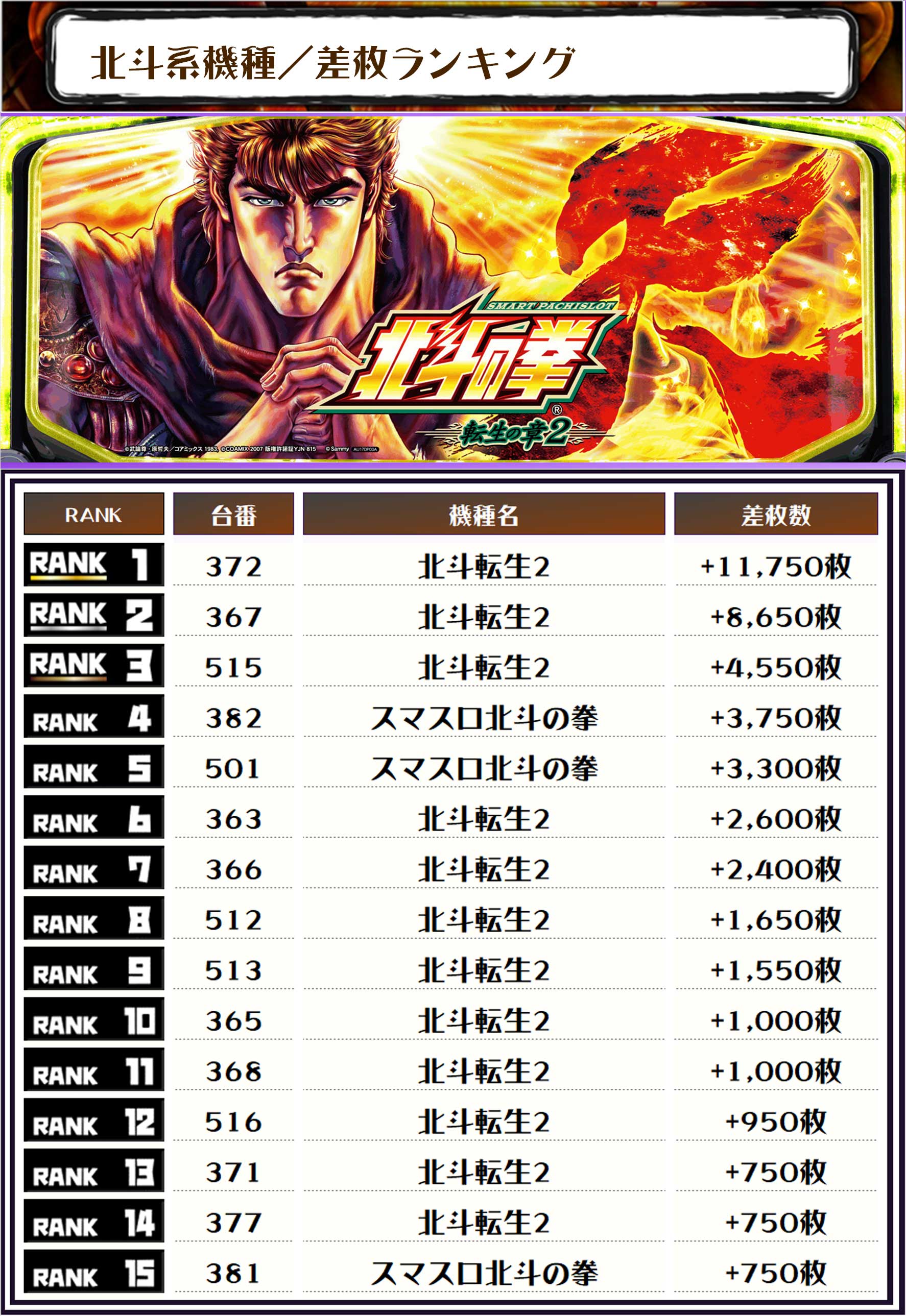 続く2位にも同じく【北斗転生2・367番台】の+8,650枚、そして3位にもこれまた【北斗転生2・515番台】の+4,550枚がランクインっ🏆
