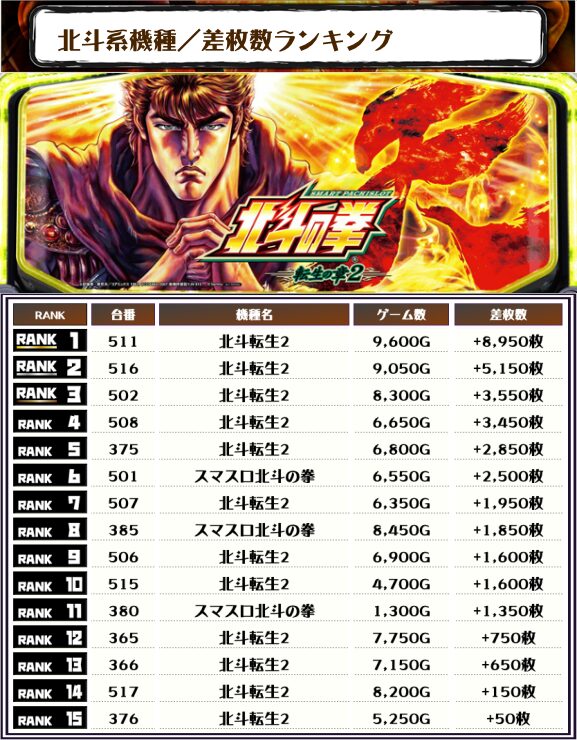 続く2位にも同じく【北斗転生2・516番台】の+5,150枚、そして3位にもこれまた【北斗転生2・502番台】の+3,550枚がランクインっ🏆