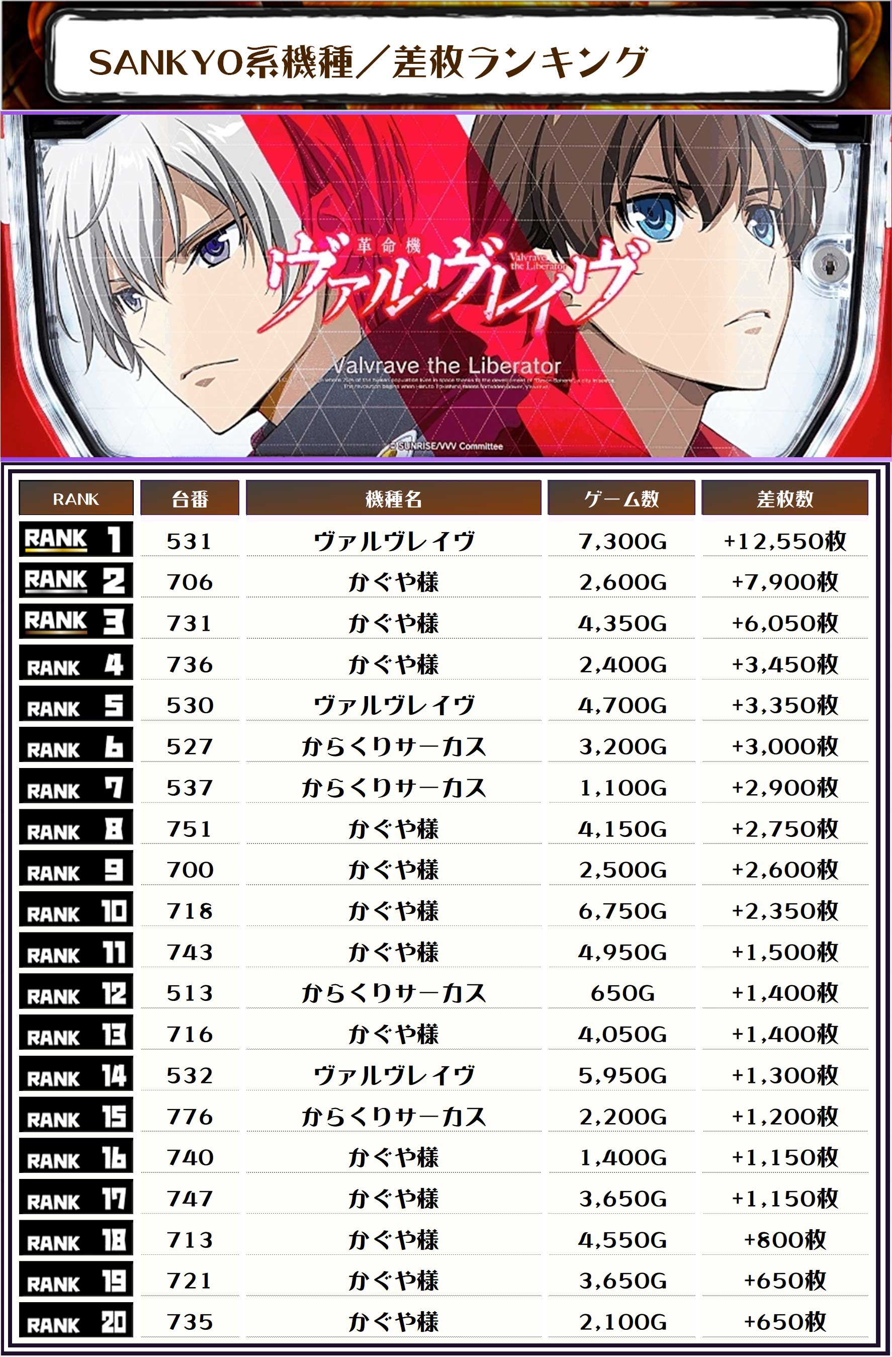 ということで、この日のトップ差枚は【ヴァルヴレイヴ・531番台】で+12,550枚‼️