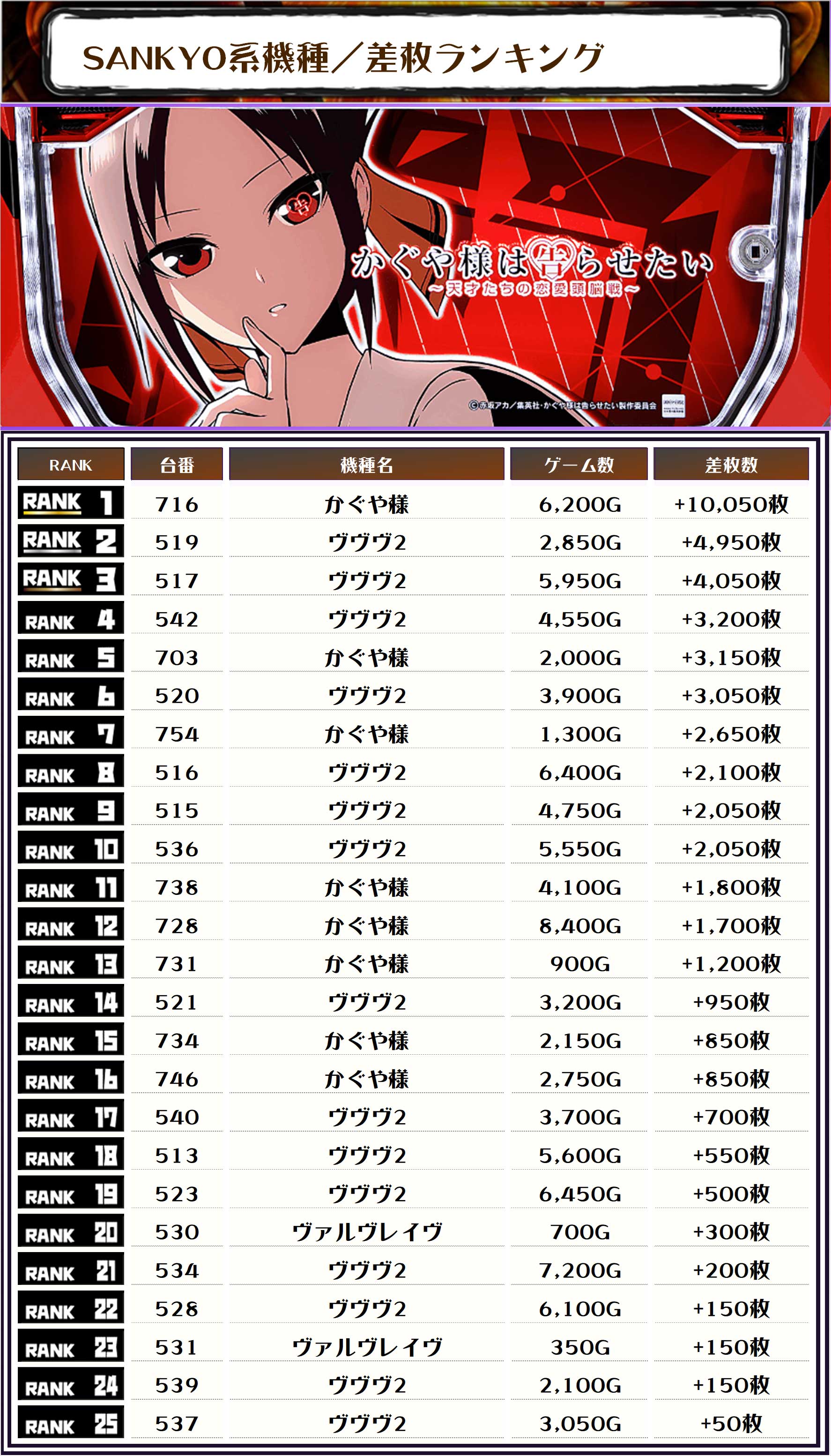ということで、この日のトップ差枚は【かぐや様・716番台】で+10050枚‼️