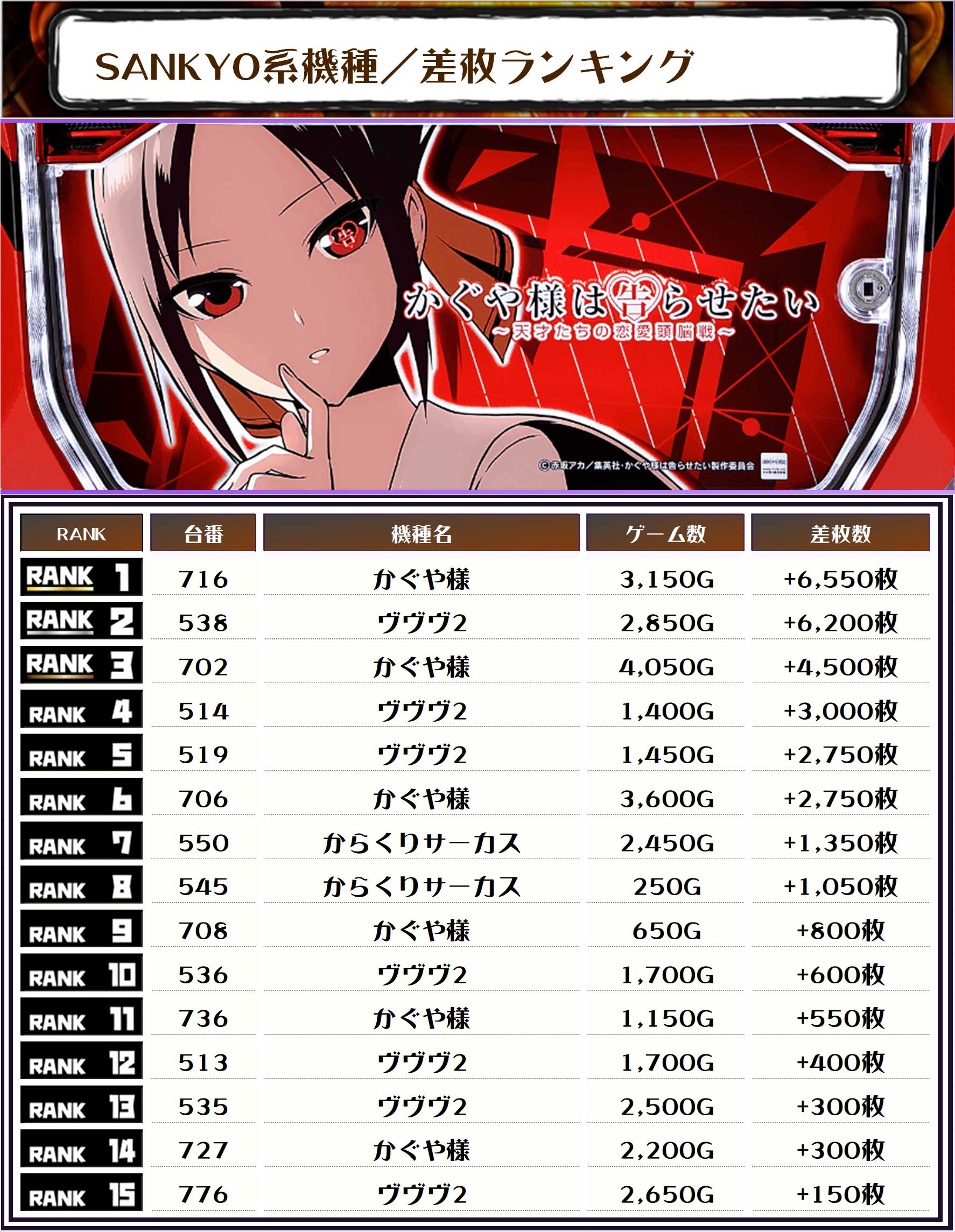 続く2位には【ヴヴヴ2・538番台】の+6,200枚、そして3位には【かぐや様・702番台】の+4,500枚がランクインっ‼️