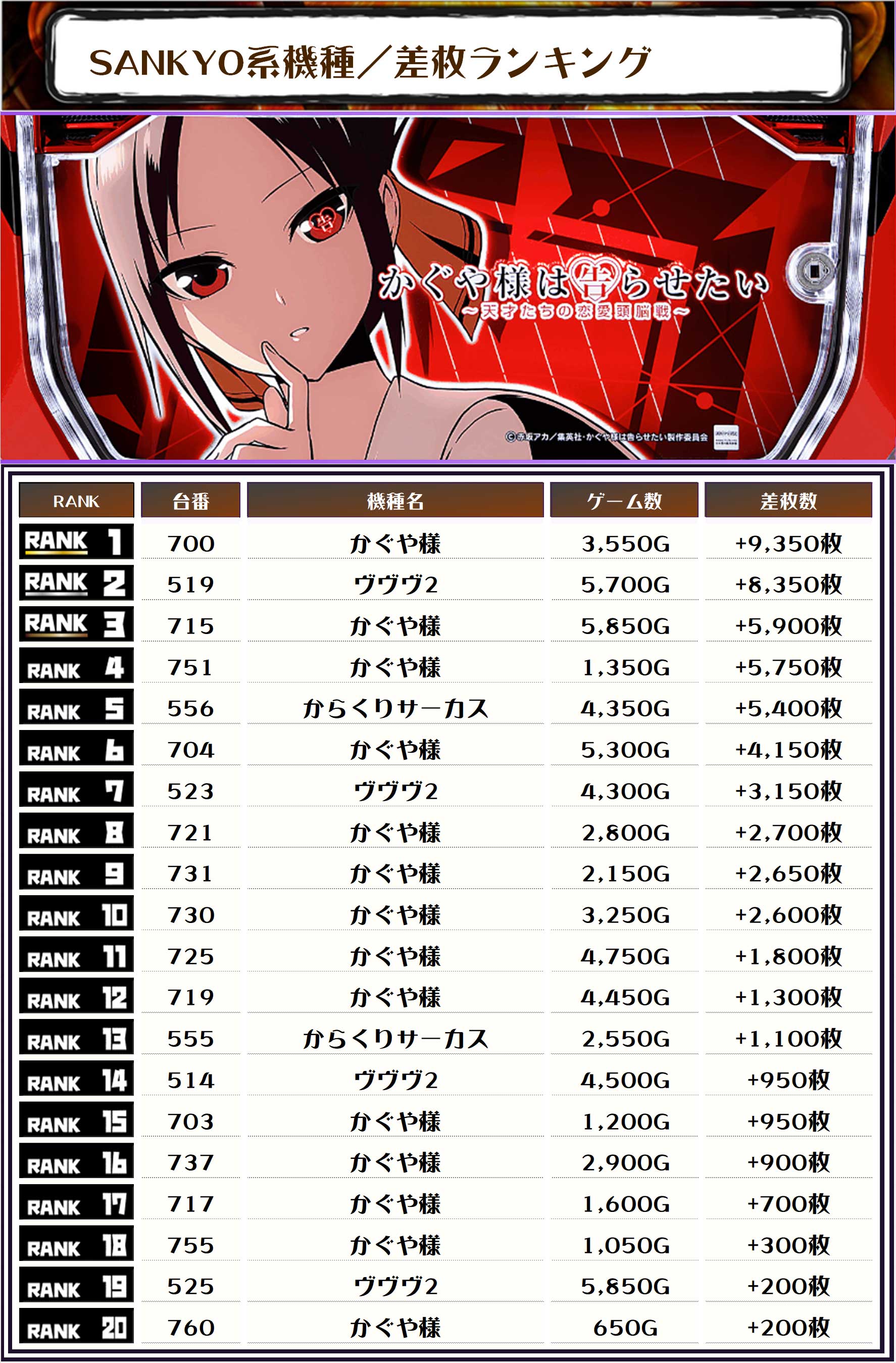 続く2位には【ヴヴヴ2・519番台】の+8,350枚、そして3位には【かぐや様・715番台】の+5,900枚がランクインっ‼️