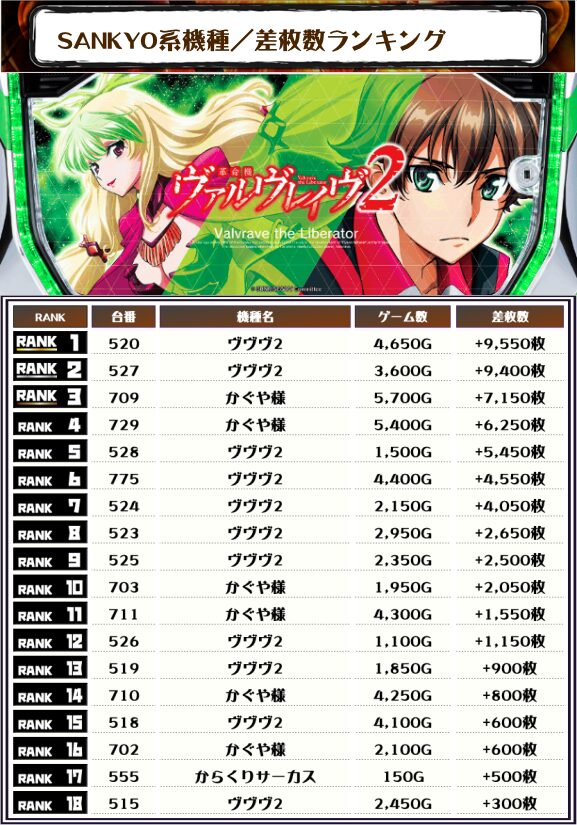 ということで、この日のトップ差枚は【ヴヴヴ2・520番台】で+9,550枚‼️