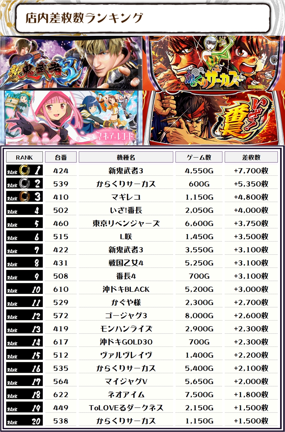 この日、全体の差枚トップに輝いたのは新台の【新鬼武者3・424番台】の+7,700枚‼️