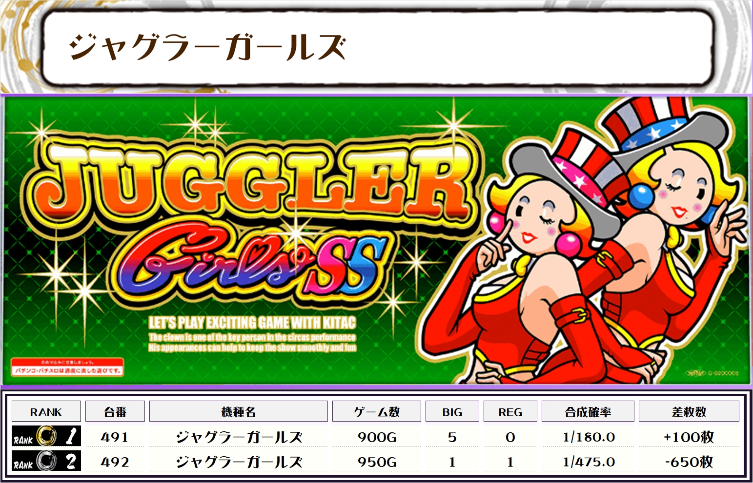 残念ながら、ピックアップ機種の不発が多かった印象です。前日も全台系だったためか敬遠されてしまった…なんて感じだったジャグラーガールズ、ゴージャグはREG先行に苦しめられたようでしたね💦