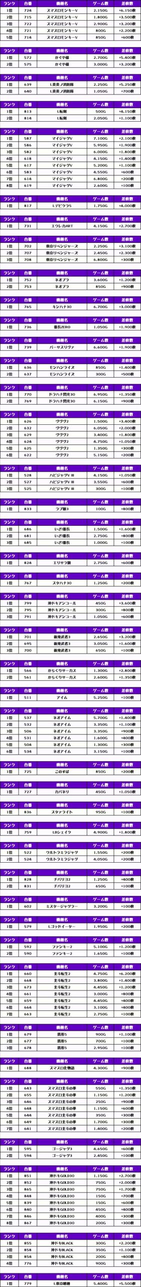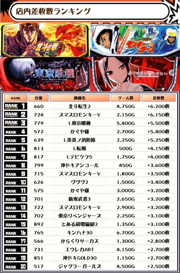 2位には【スマスロモンキーV・724番台】の+6,150枚、3位は【L東京喰種・779番台】の5,500枚がランクインっ🏆🏆🏆🏆