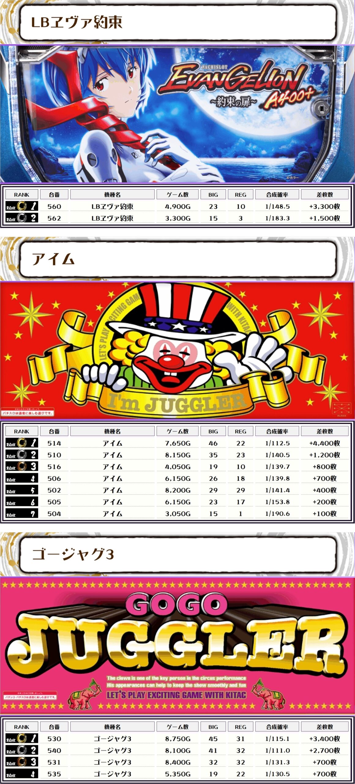 今回ピックアップしたのは稼働が良かったり、勝率の高い機種でしたが、それ以外にも優秀台が単体で数多くありましたね💪