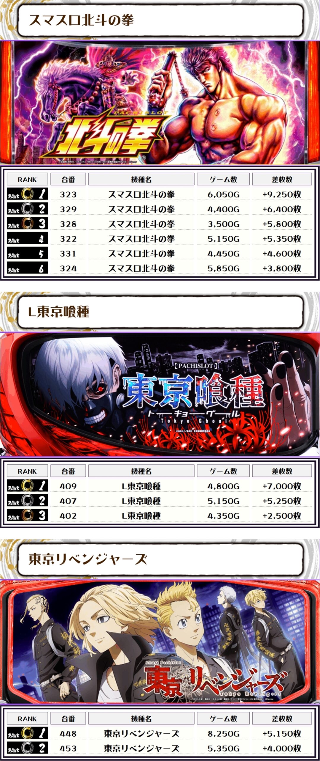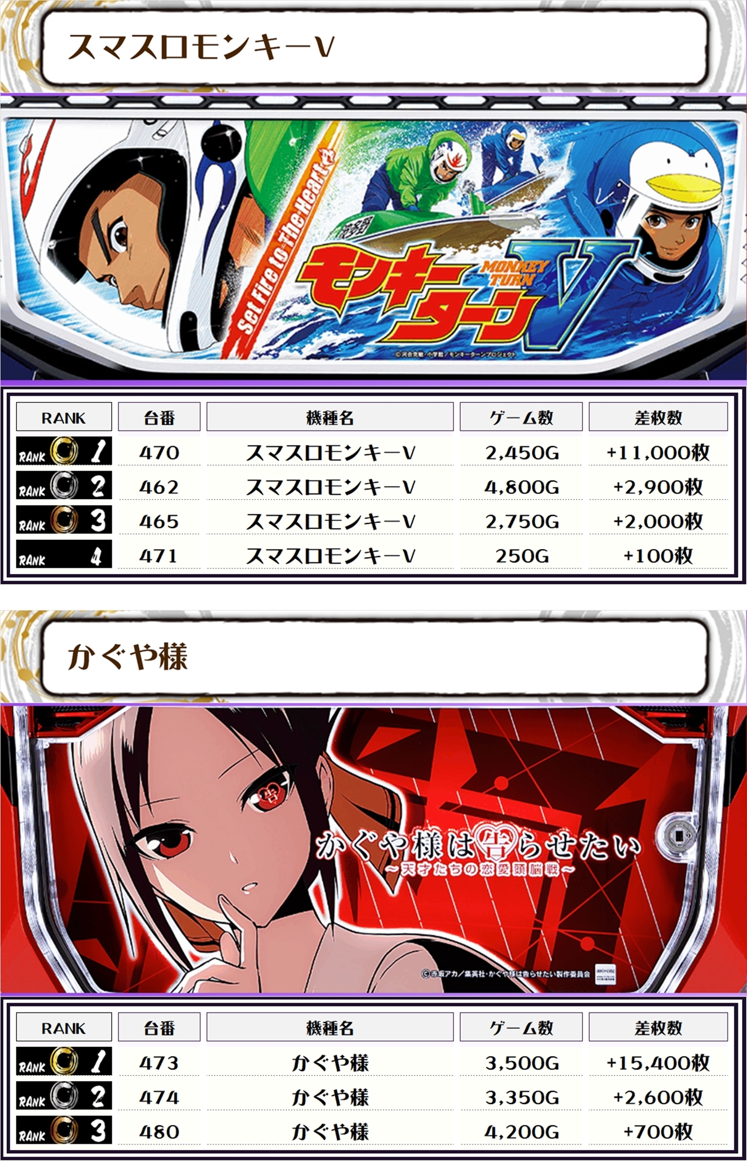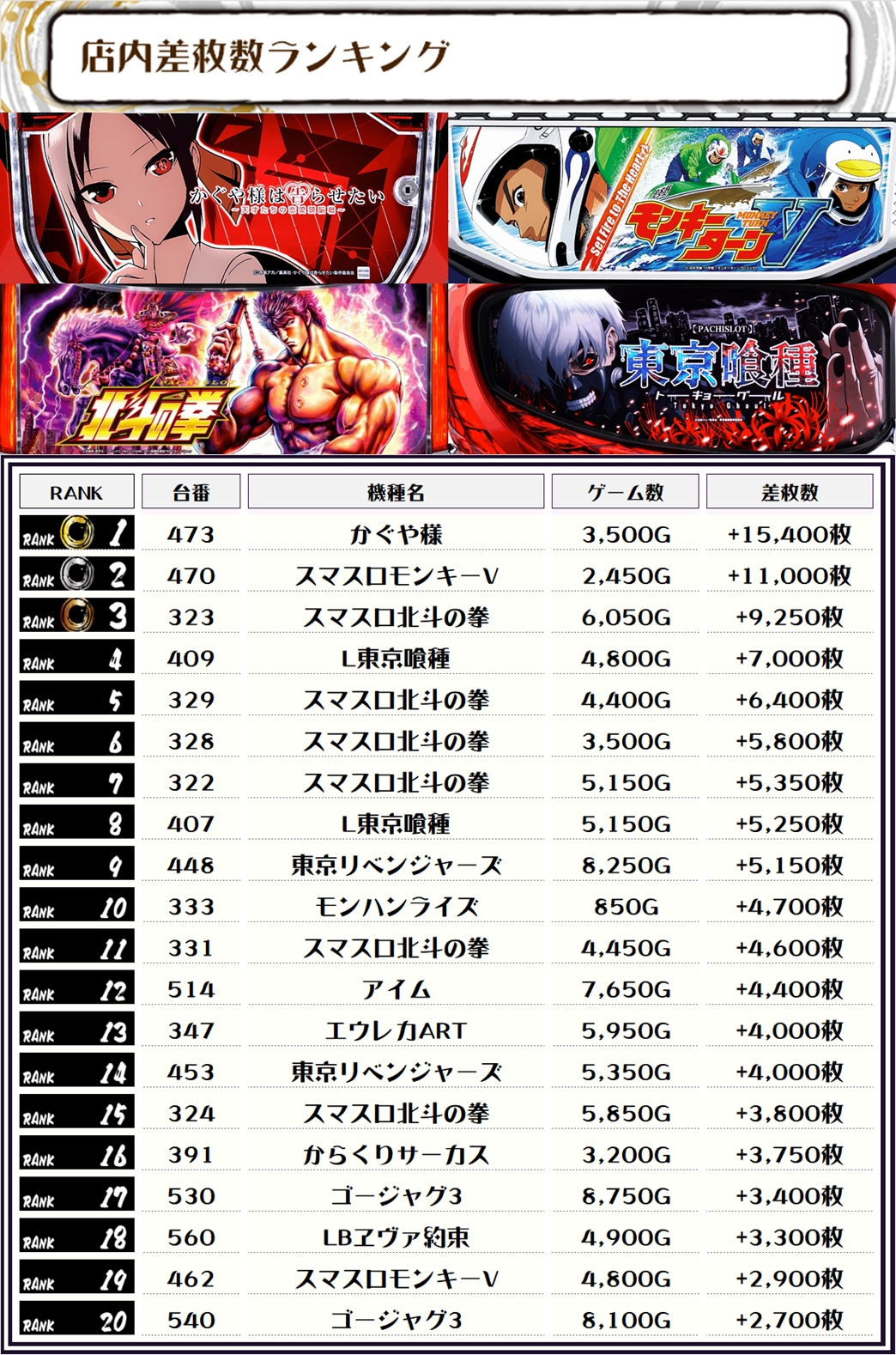 2位には【スマスロモンキーV・470番台】の+11,000枚、3位には【スマスロ北斗の拳・323番台】の9,250枚がランクインっ🏆🏆🏆🏆