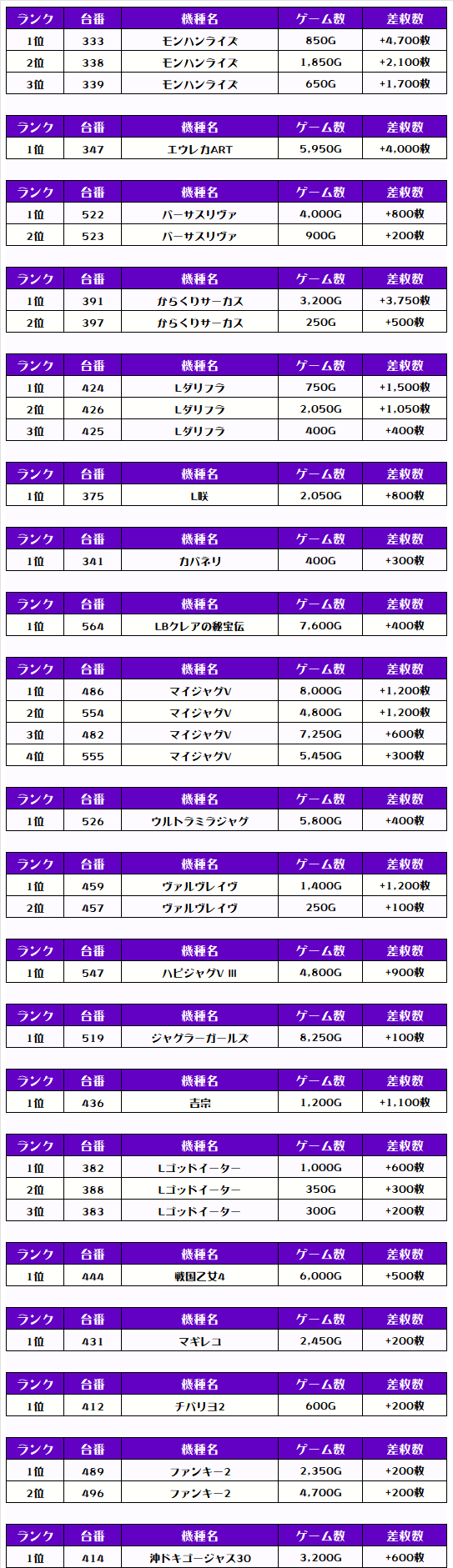 また、この日の注目台差枚ランキングがこちら❗️