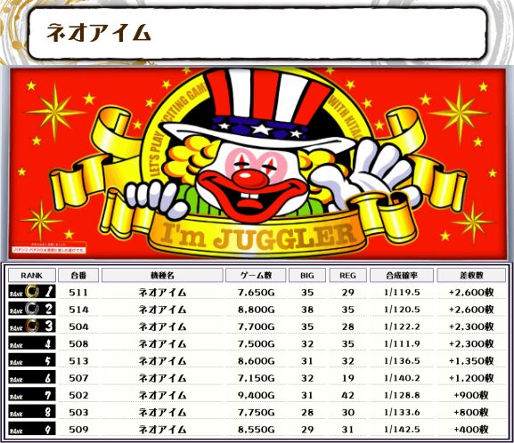 また、ネオアイムも半数以上が差枚数プラスと盛り上がっていましたね