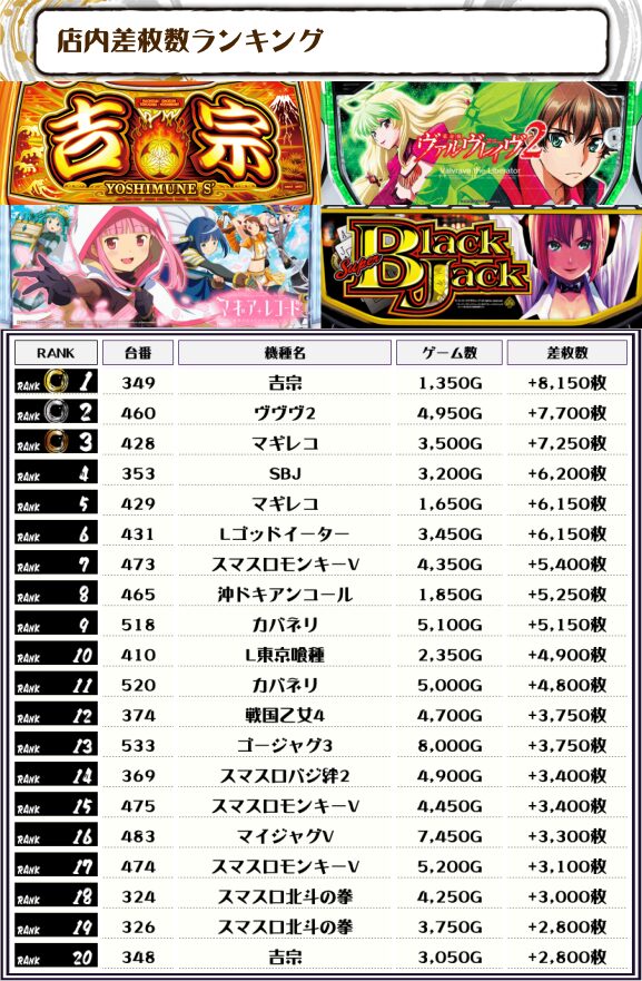特に吉宗・カバネリは全台が差枚数プラスでした〜👏