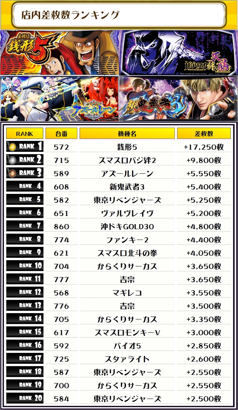 続く2位には【スマスロバジ絆2・715番台】の+9,800枚、そして3位には【アズールレーン・589番台】の+5,550枚がランクインしましたっ❗️