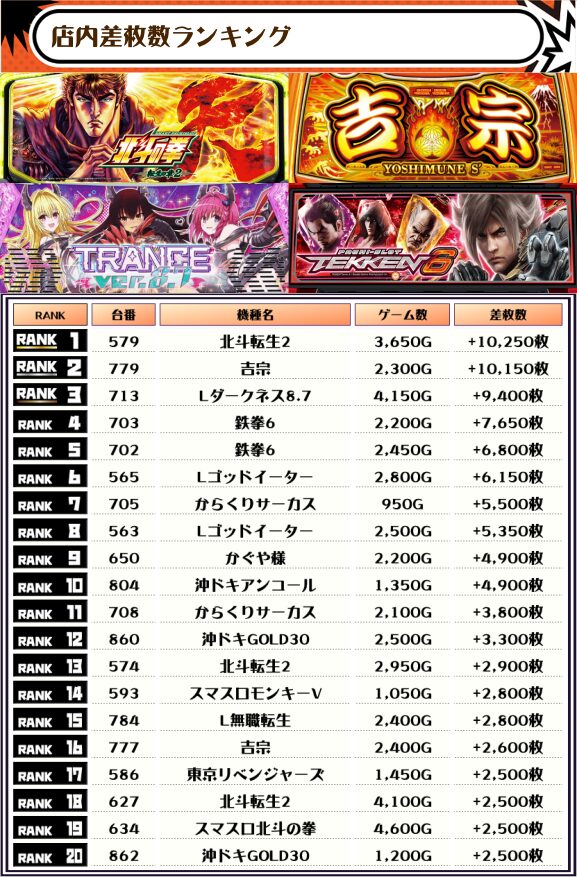 2位には【吉宗・779番台】の+10,150枚、3位には【Lダークネス8.7・713番台】の9,400枚がランクインっ🏆🏆🏆🏆