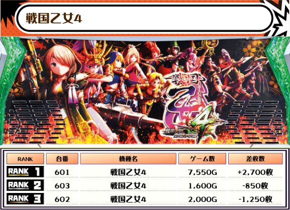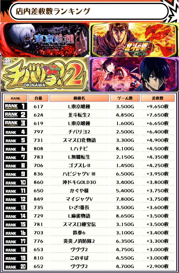 2位には【北斗転生2・624番台】の+7,650枚、3位には【L東京喰種・619番台】の6,650枚がランクインっ🏆🏆🏆🏆