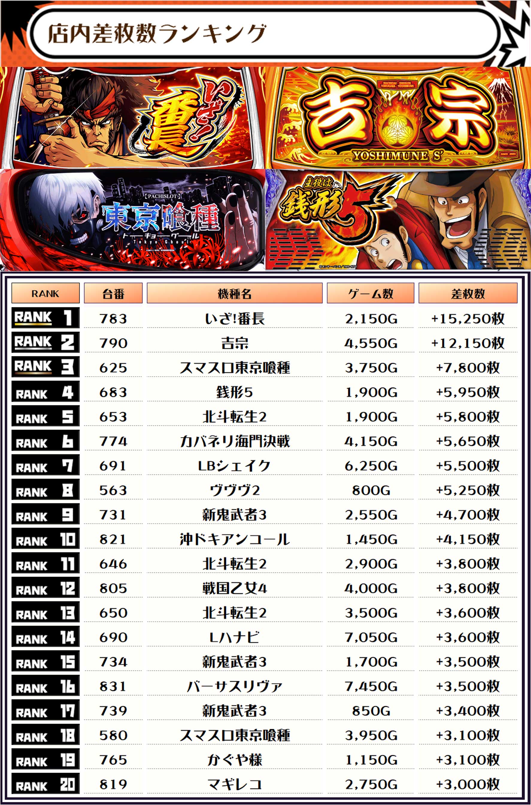 2位には【吉宗・790番台】の+12,150枚、そして3位には【スマスロ東京喰種・625番台】の+7,800枚がランクインっ🏆🏆🏆🏆