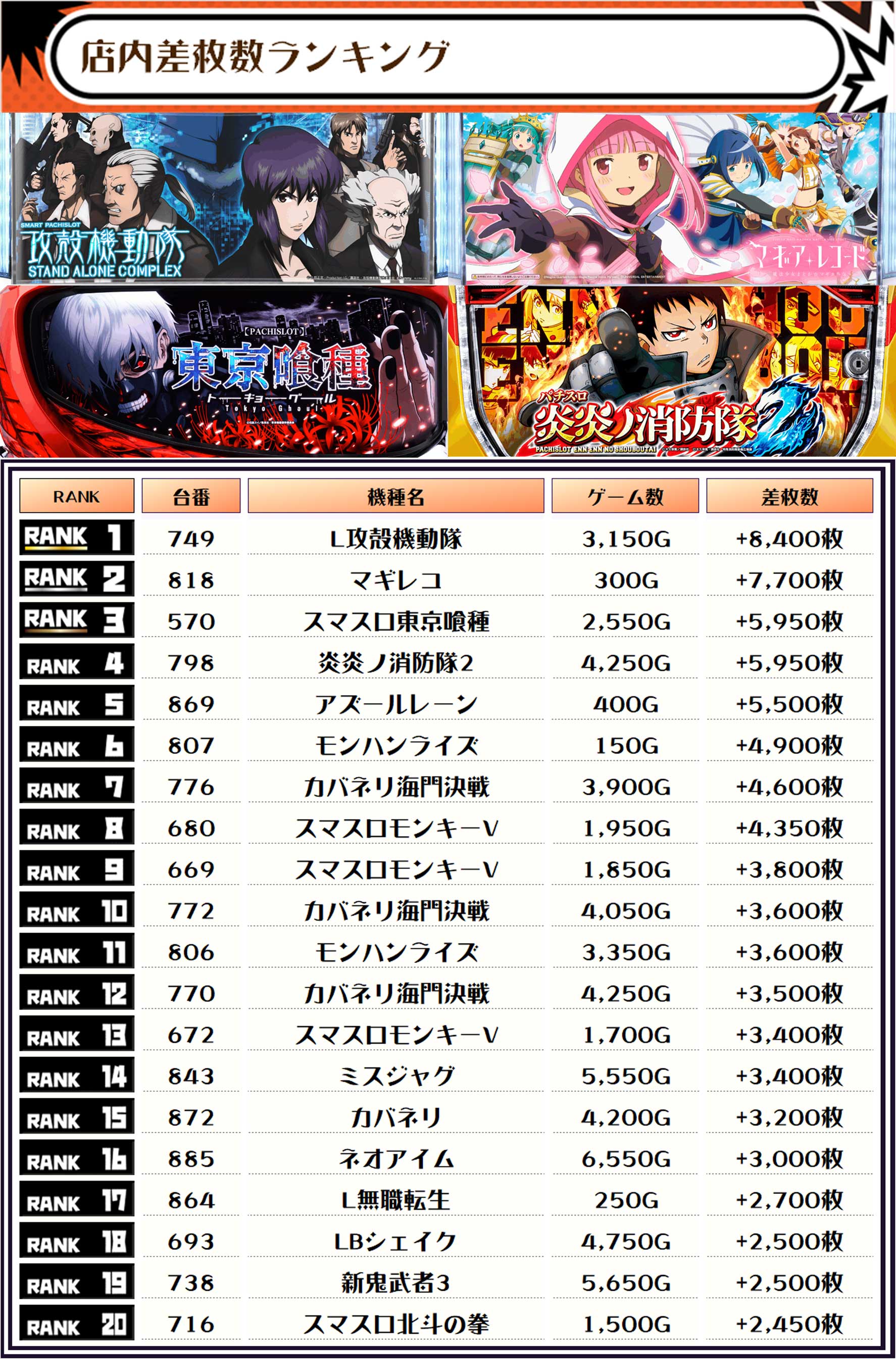2位には【マギレコ・818番台】の+7,700枚、そして3位には【スマスロ東京喰種・570番台】の+5,950枚がランクインっ🏆🏆🏆🏆