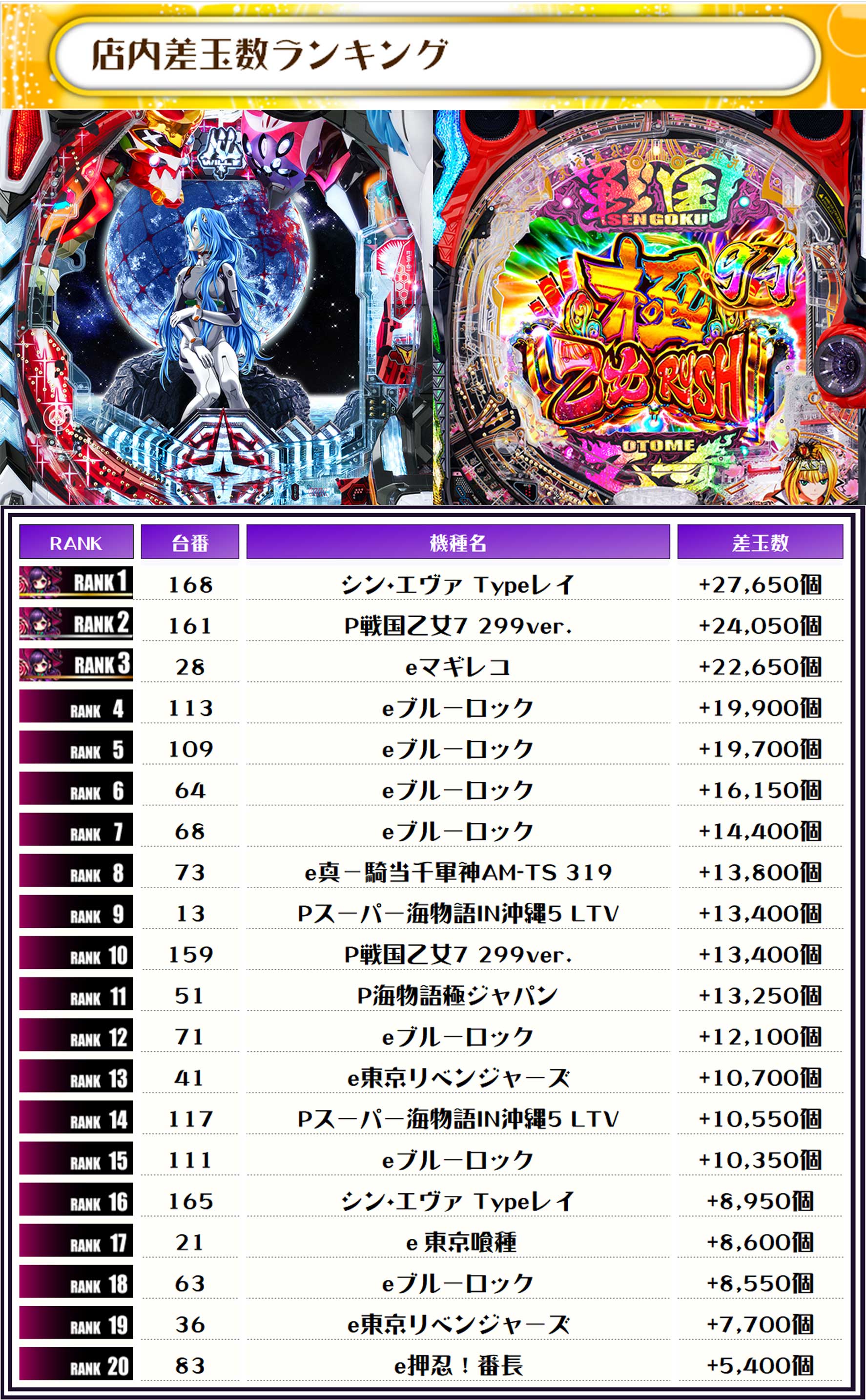 2位には【P戦国乙女7 299ver.・161番台】の+24,050発、そして3位には【eマギレコ・28番台】の+22,650発がランクインしました~✨