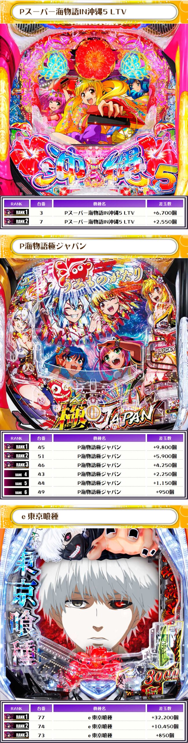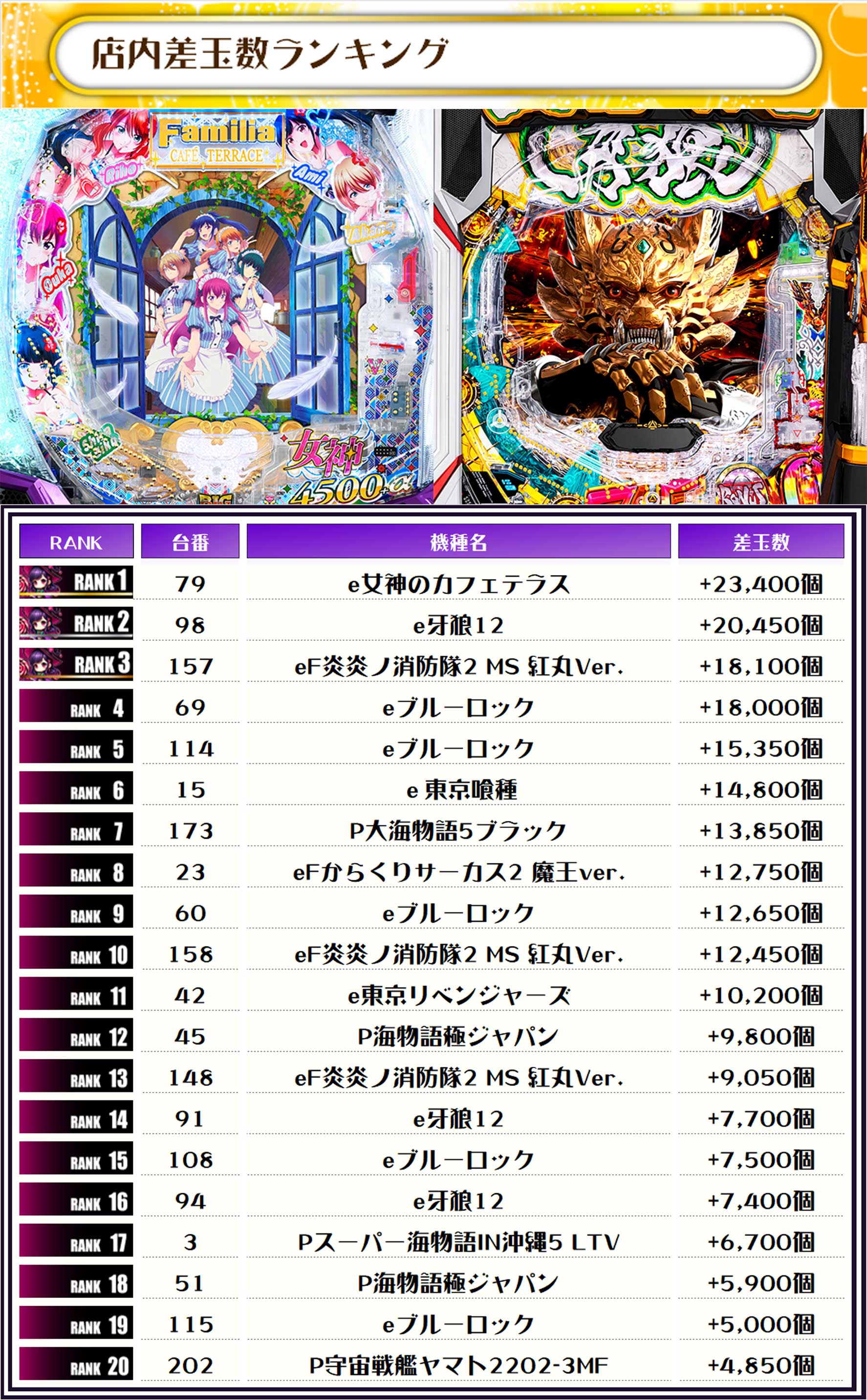 2位には【e牙狼12・98番台】の+20,450発、そして3位には【eF炎炎ノ消防隊2 MS 紅丸Ver.・157番台】の+18,100発がランクインしました~✨