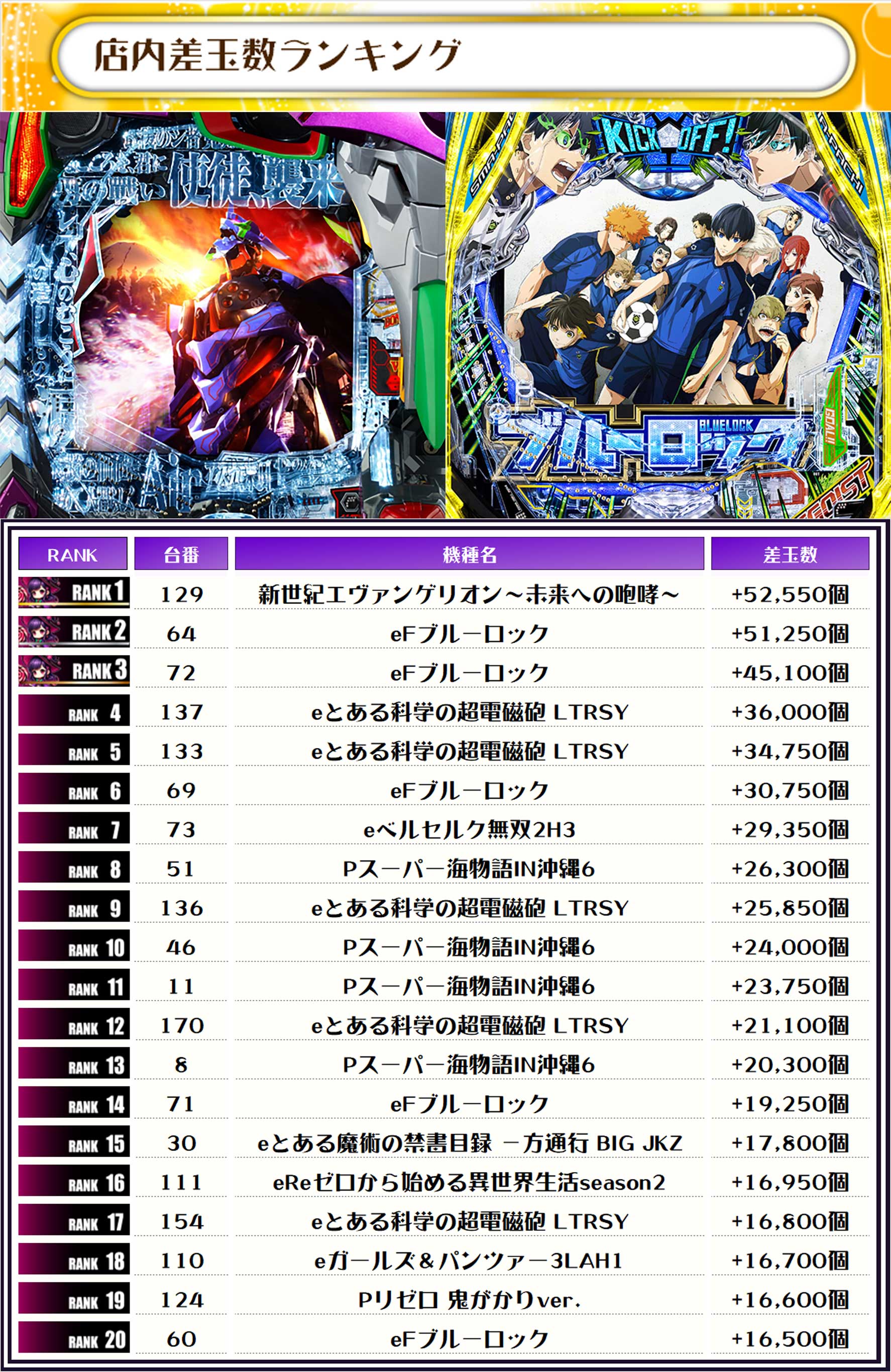 出玉TOPは【新世紀エヴァンゲリオン~未来への咆哮~・129番台】で+52,550発💥💥💥