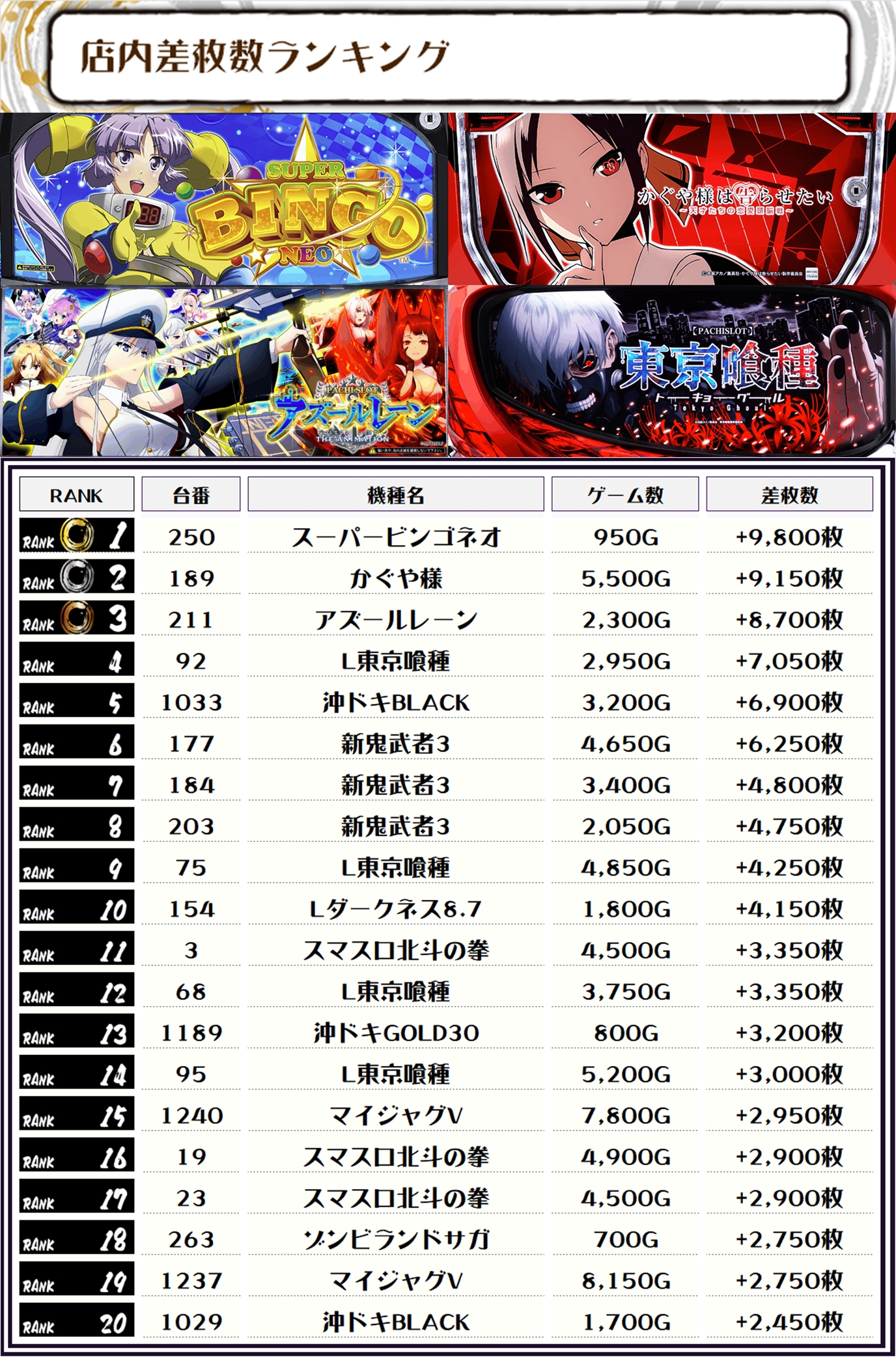 全体のTOPは【スーパービンゴネオ・250番台】で+9,800枚‼️