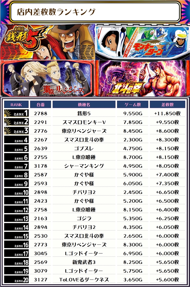 そして2位には【スマスロモンキーV・2291番台】の+9,550枚、3位には【東京リベンジャーズ・2776番台】の+8,600枚がランクインっ🏆🏆🏆🏆