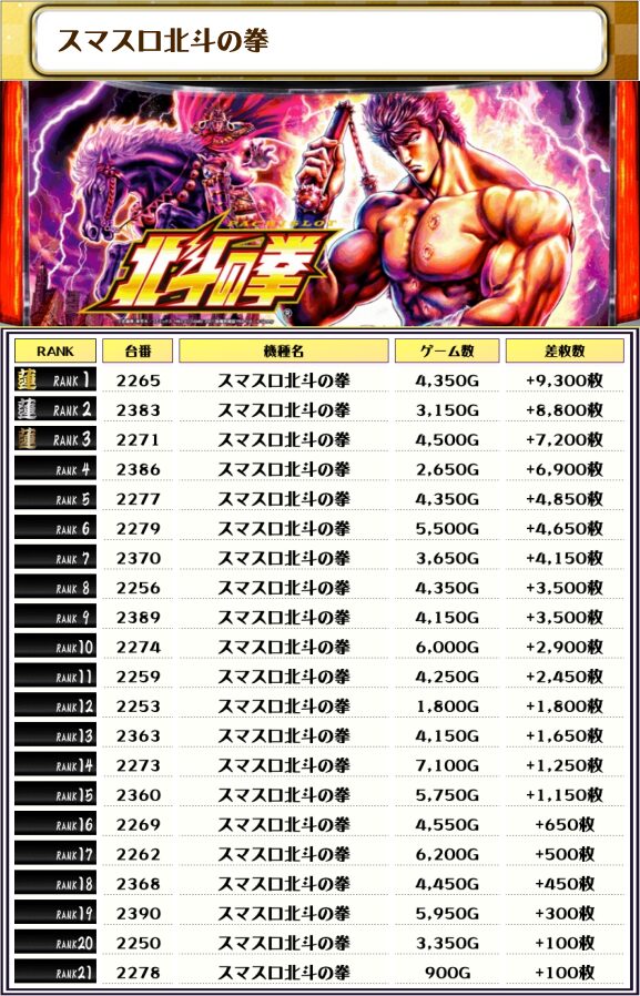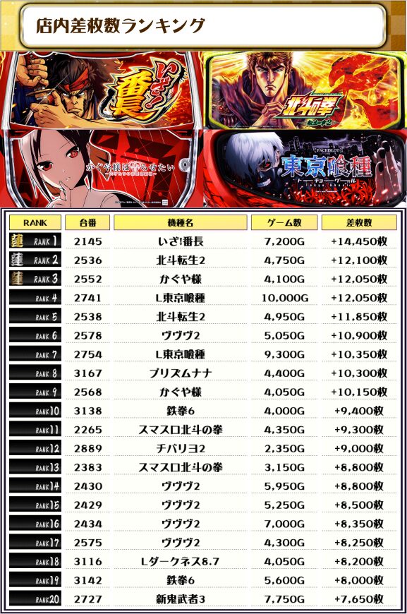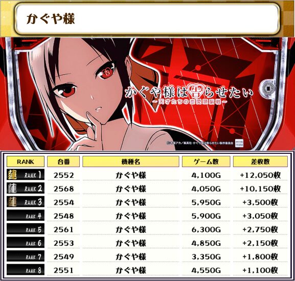 そして2位には【北斗転生2・2536番台】の+12,100枚、そして3位には【かぐや様・2552番台】の+12,050枚がランクインっ🏆🏆🏆🏆
