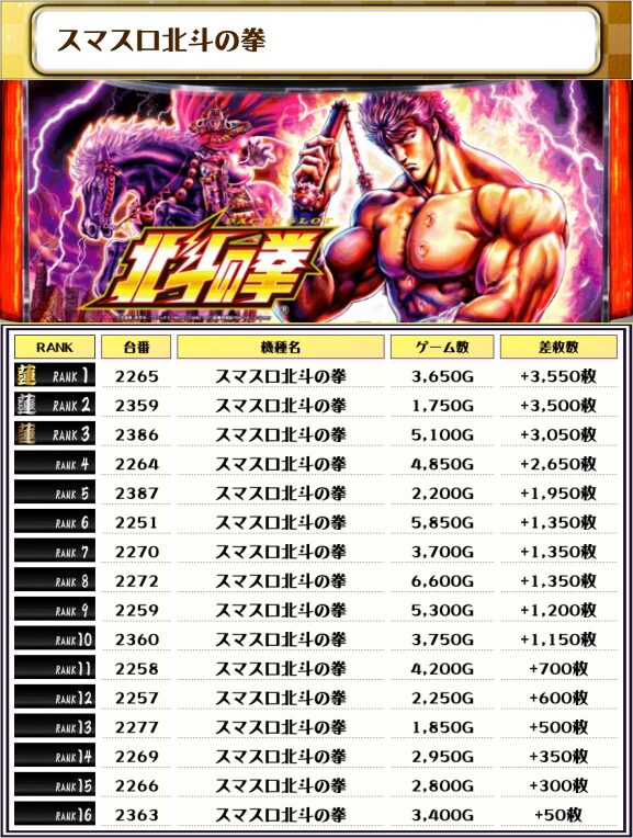 そして2位には【北斗転生2・2538番台】の+10,750枚、そして3位には【スマスロモンキーV・2803番台】の+10,250枚がランクインっ🏆🏆🏆🏆