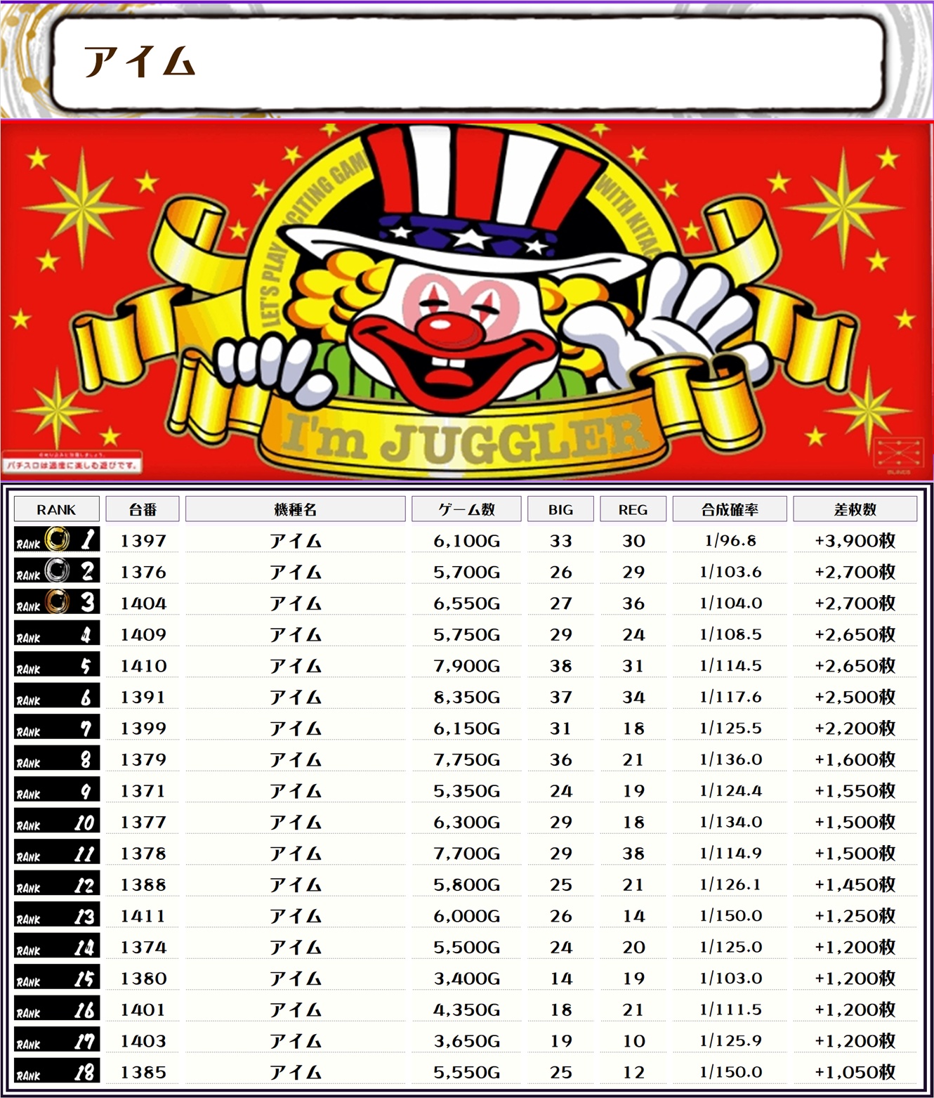 それでは早速【機種別差枚ランキング】をチェックしていきましょう🙆♀️