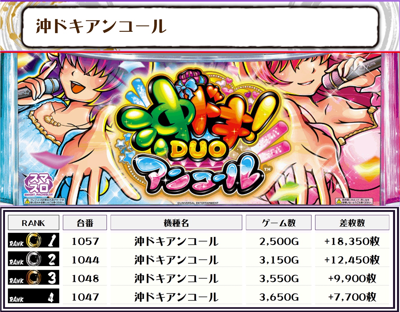 この日、全体の差枚TOPに輝いたのは【沖ドキアンコール・1057番台】で+18,350枚‼️