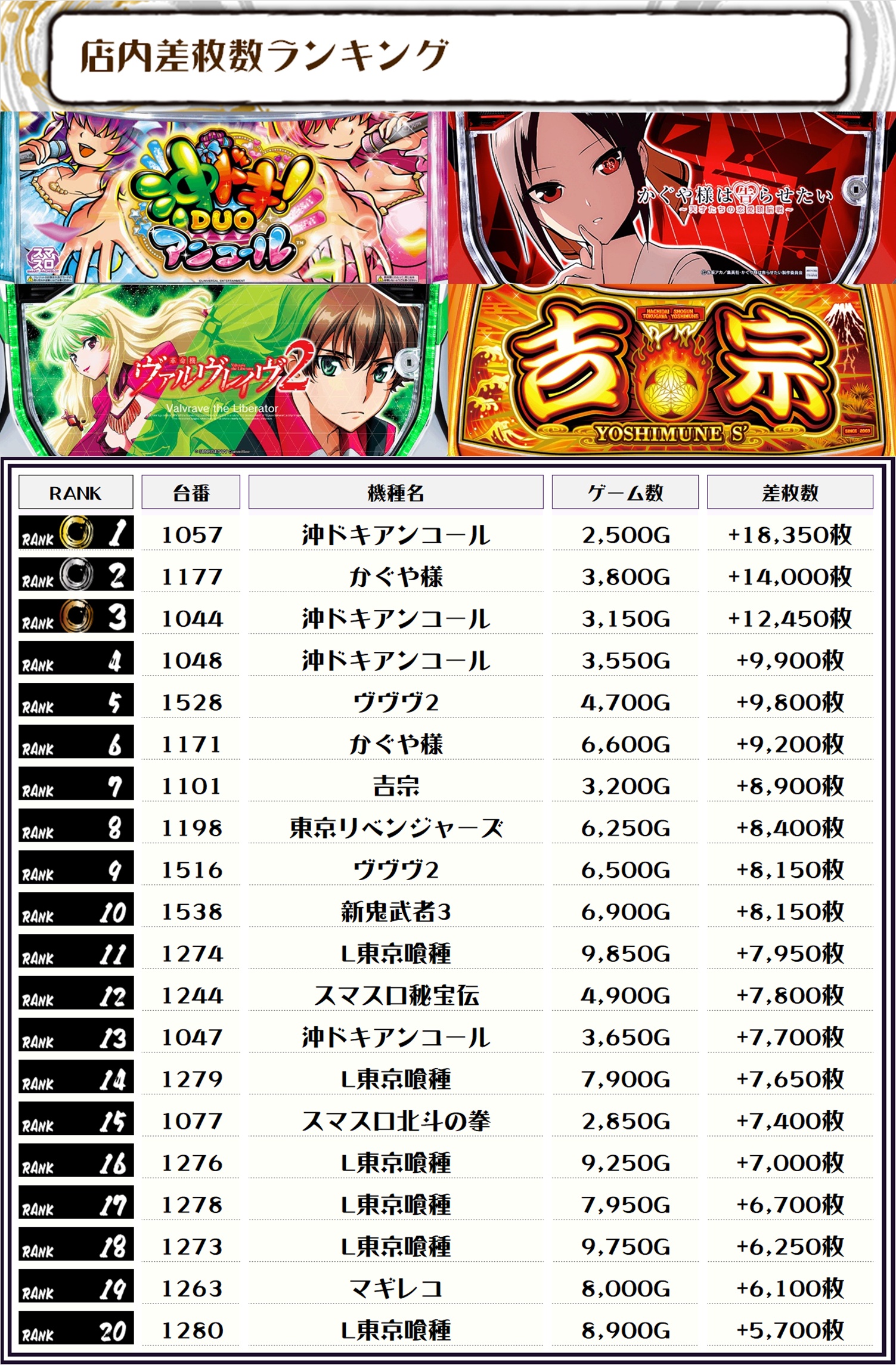 続く2位には【かぐや様・1177番台】の+14,000枚、そして3位には【沖ドキアンコール・1044番台】の+12,450枚がランクインですっ🏆🏆🏆