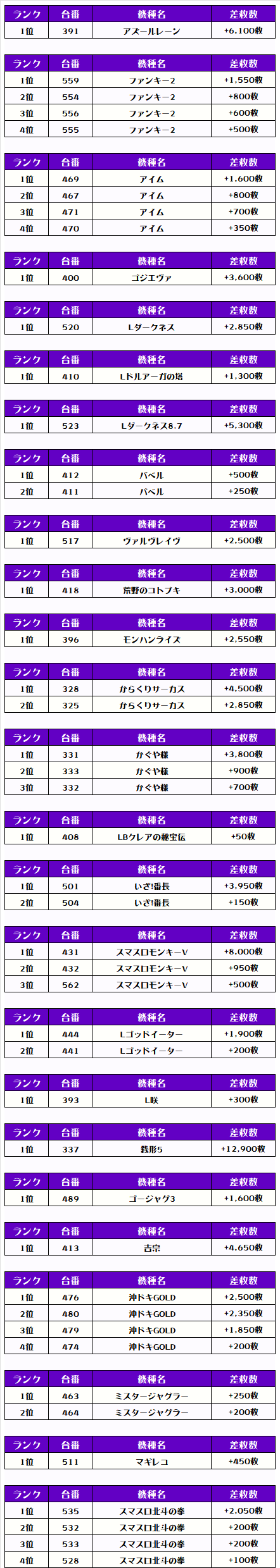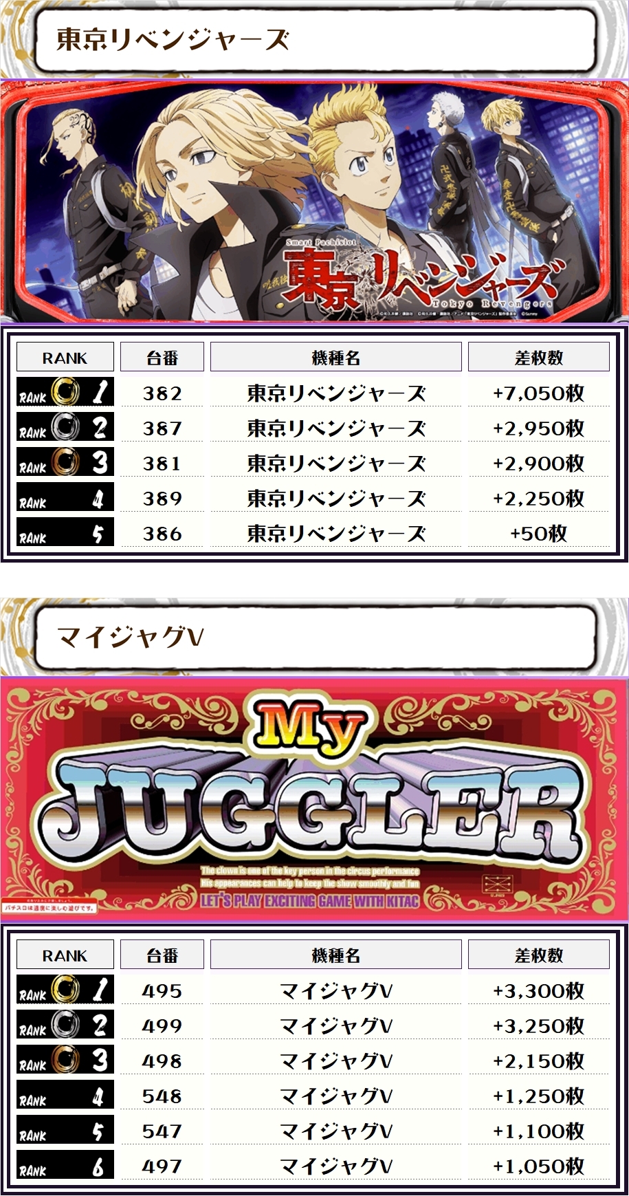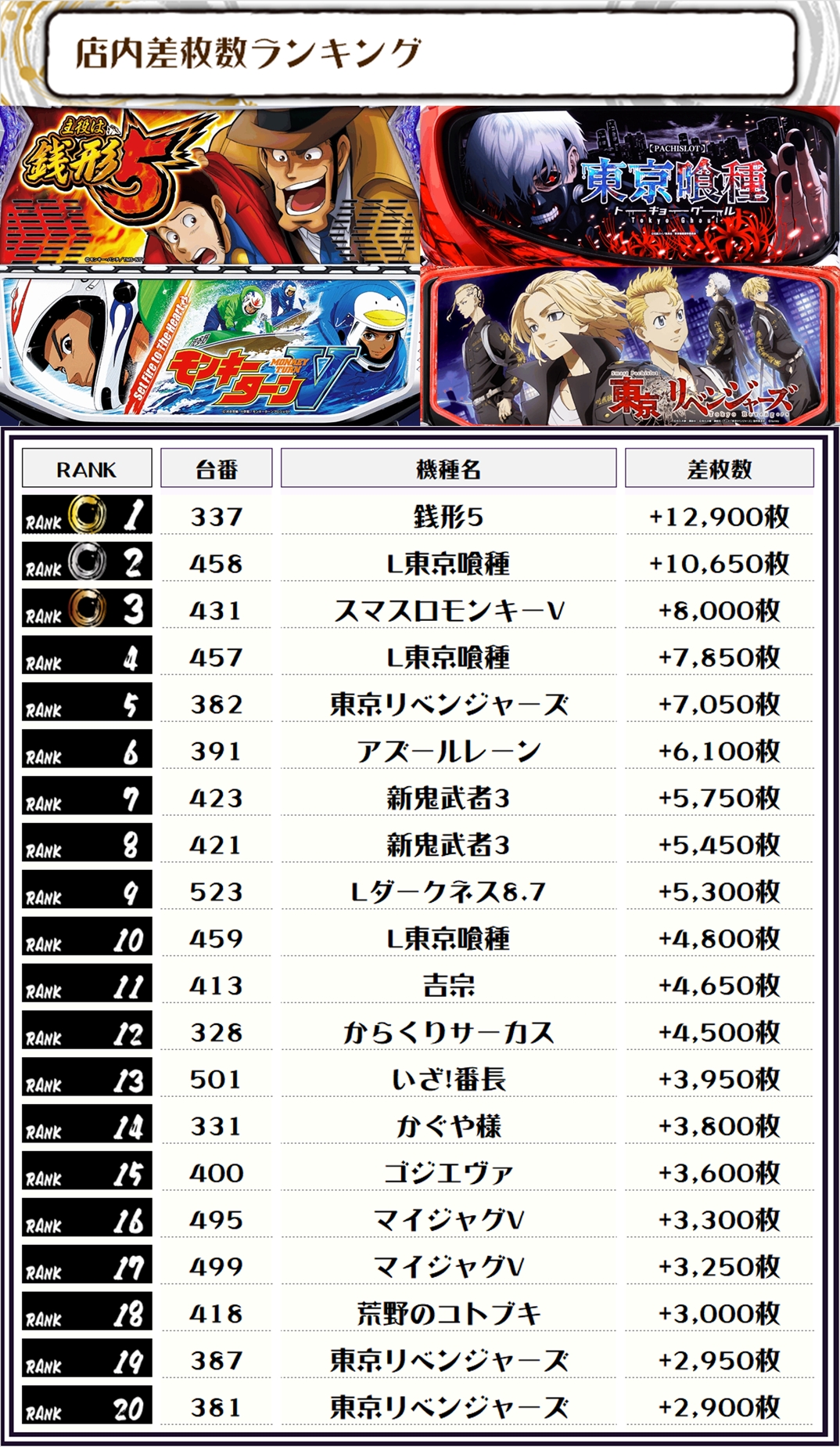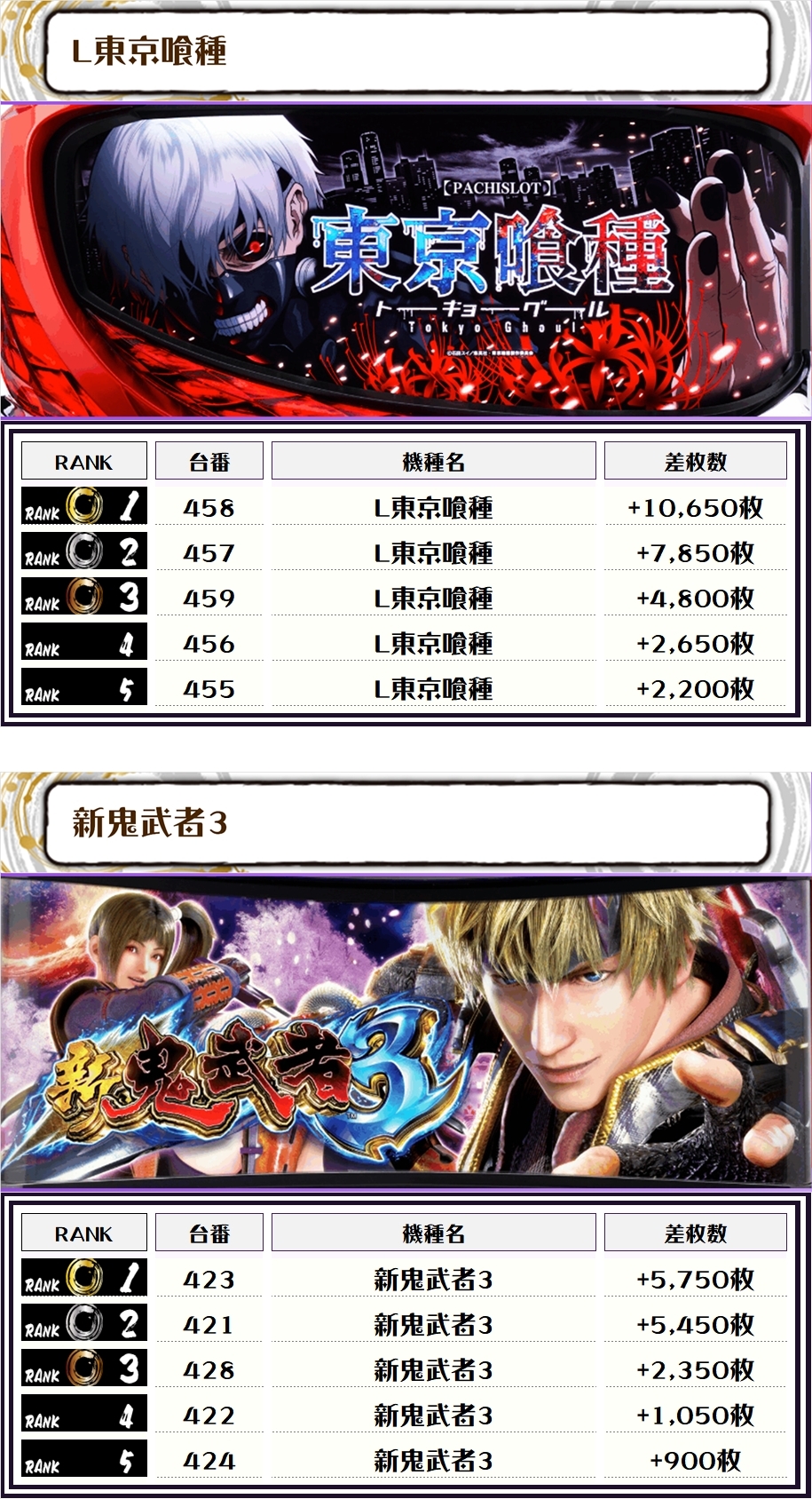 2位には【L東京喰種・458番台】の+10,650枚、そして3位には【スマスロモンキーV・431番台】の+8,000枚がランクインっ🏆🏆🏆🏆