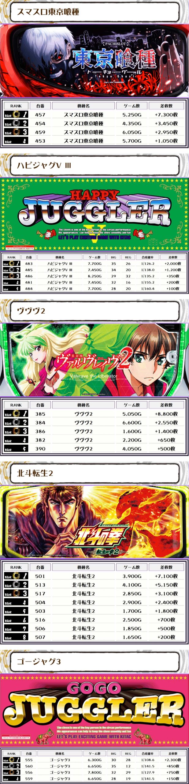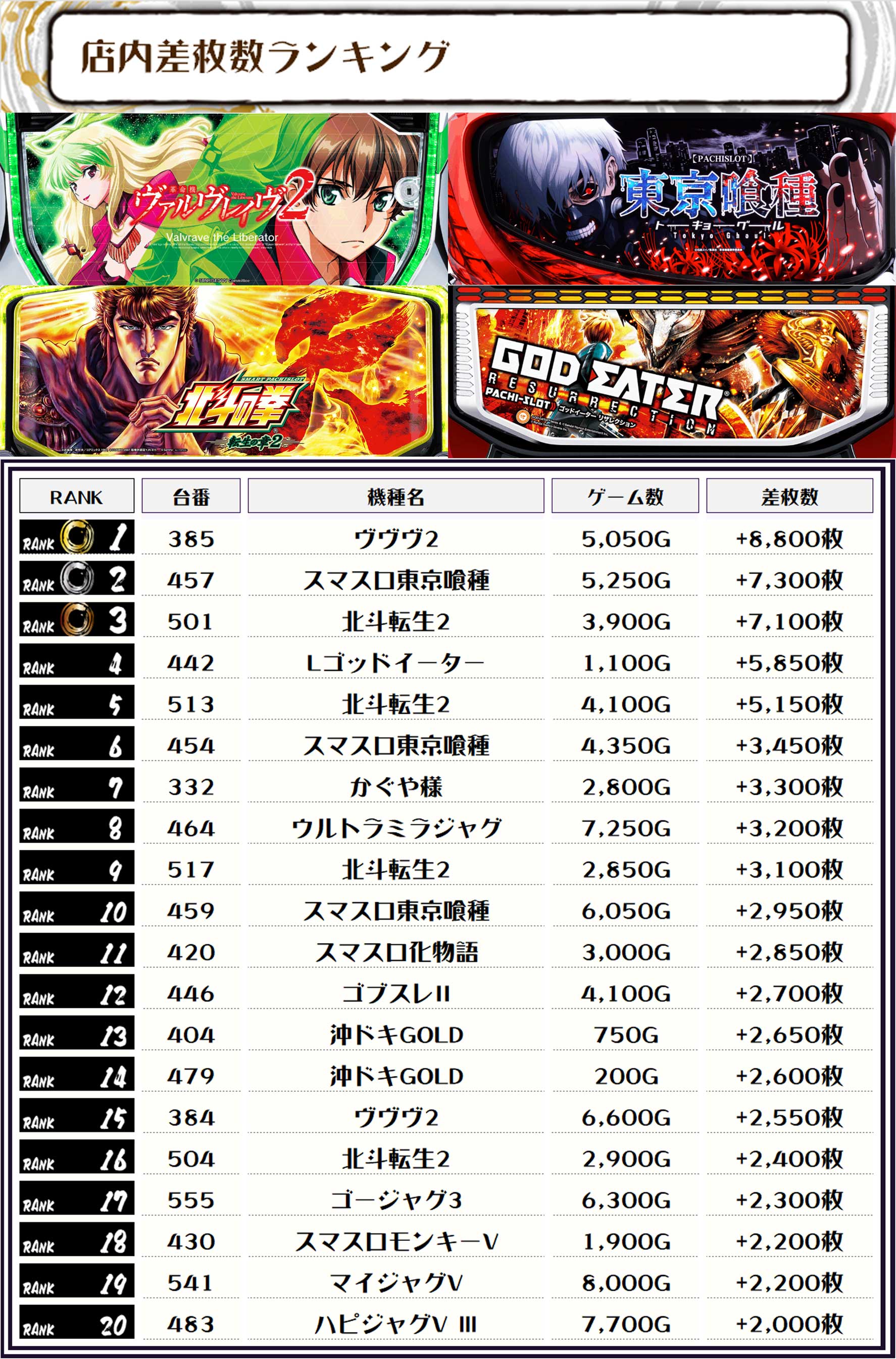 続く2位には【スマスロ東京喰種・457番台】の+7,300枚、そして3位には【北斗転生2・501番台】の+7,100枚がランクインですっ❗️