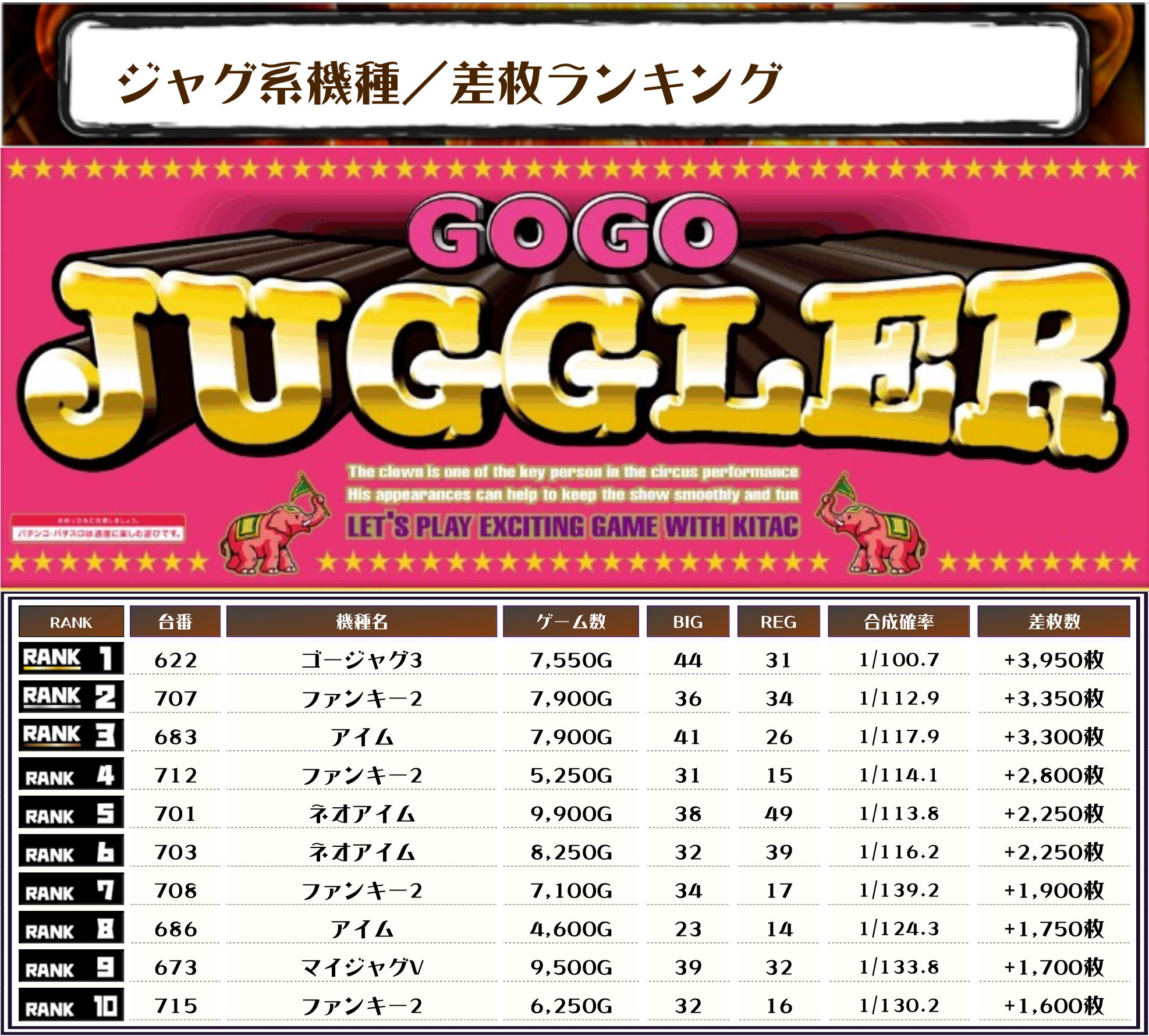 ということで、この日のトップ差枚は【ゴージャグ3・622番台】の+3,950枚でした🤡✨