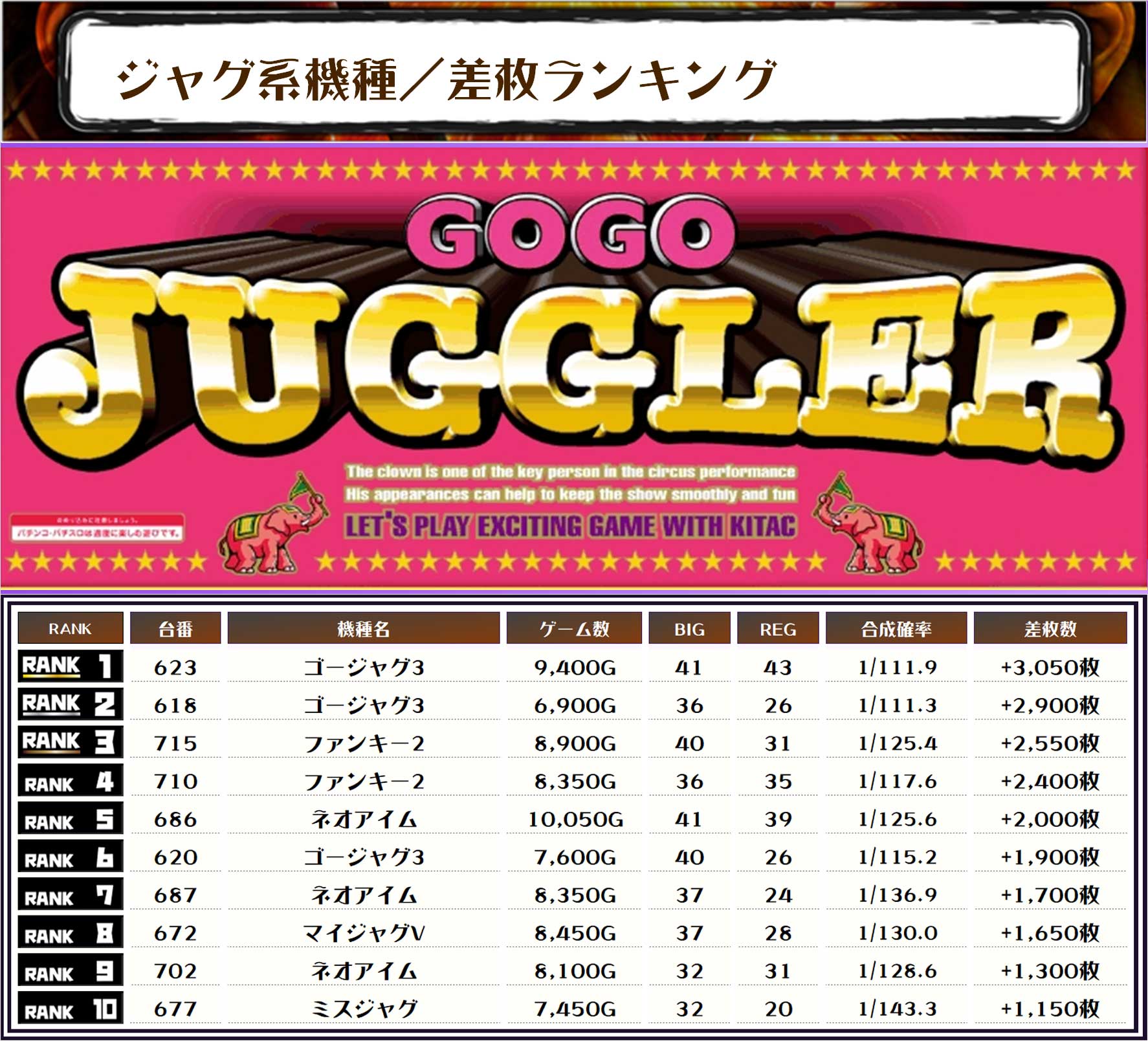 続く2位には【ゴージャグ3・618番台】の+2,900枚、そして3位には【ファンキー2・715番台】の+2,550枚がランクインっ👍