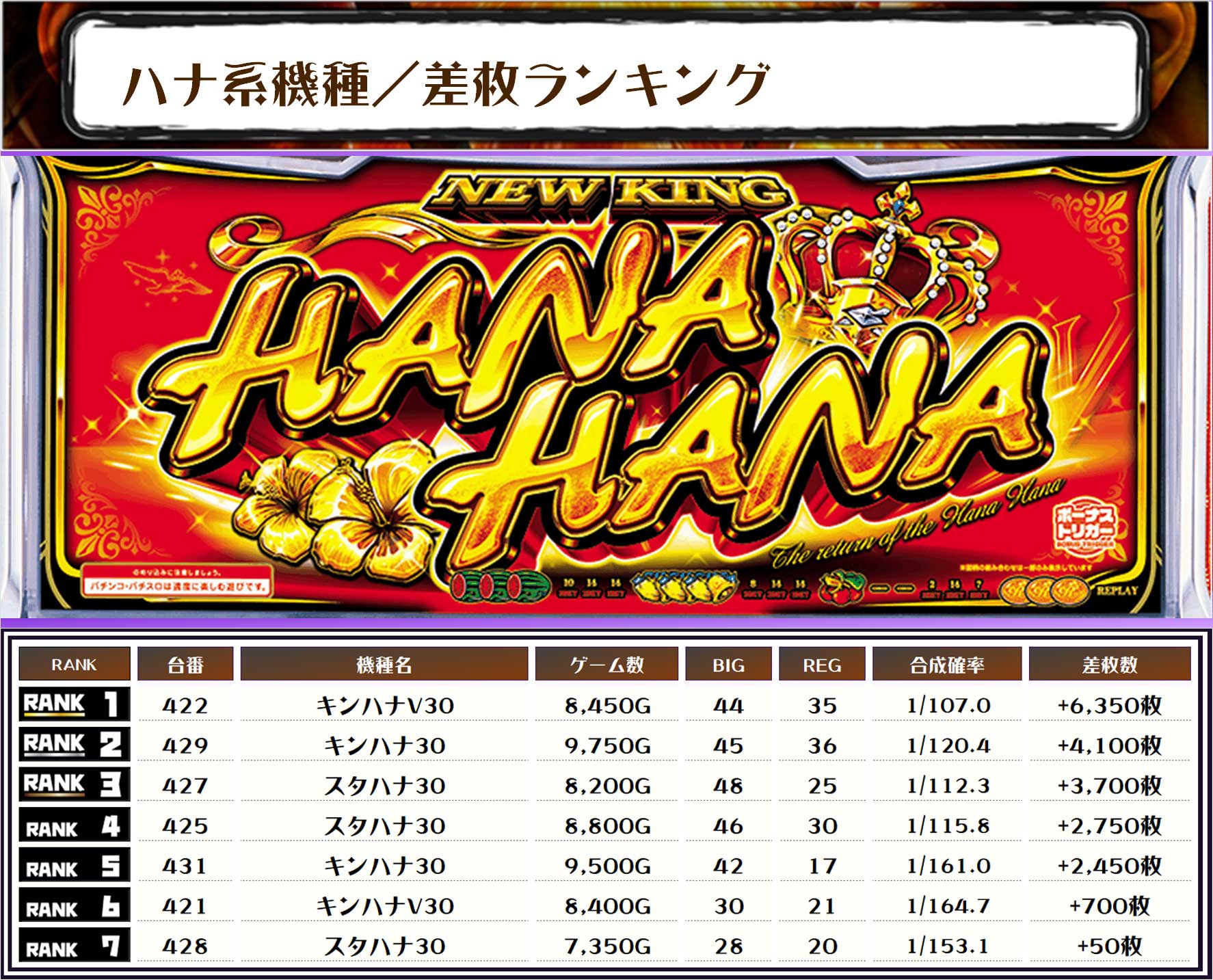 全体のTOP差枚は【キンハナV30・422番台】で+6,350枚👍