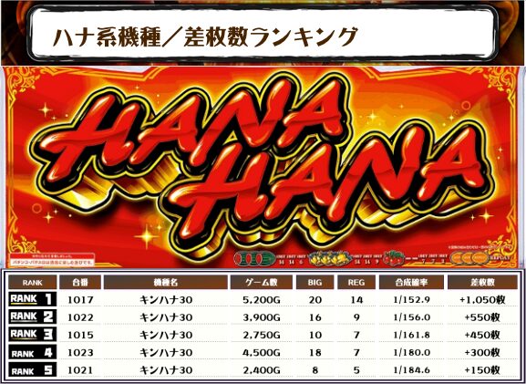 また、2位には【キンハナ30・1022番台】の+550枚、3位には【キンハナ30・1015番台】の+450枚がランクイン