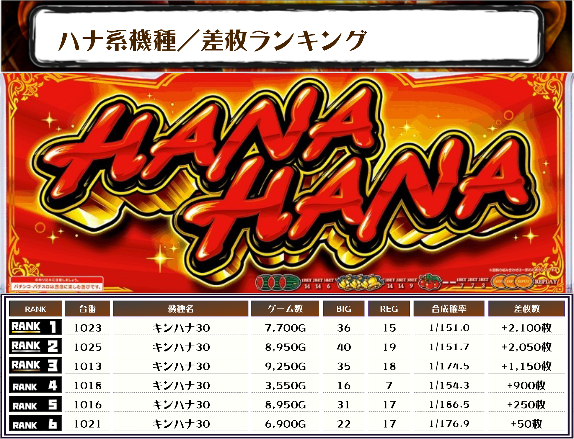 それでは、今回の差枚ランキングをご覧ください