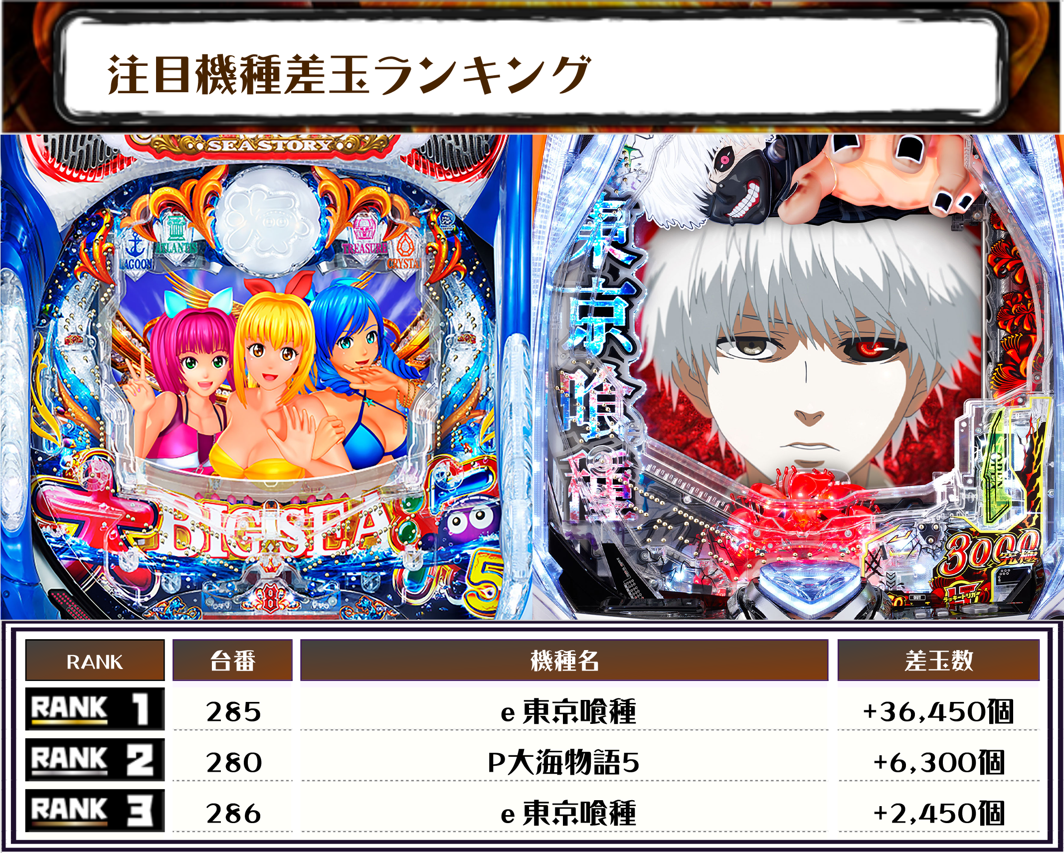 また、2位には【P大海物語5・280番台】の+6,300発、3位は【e東京喰種・286番台】の+2,450発がランクインしました🏆
