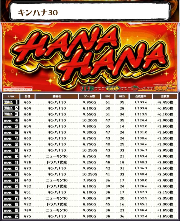 この日のトップ差枚は【キンハナ30・865番台】の+8,450枚👑